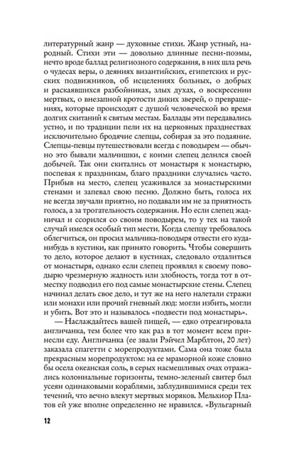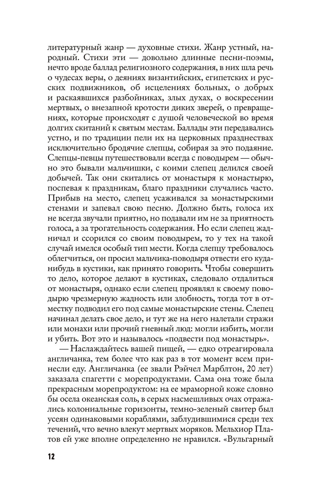 «Странствие по таборам и монастырям» писателя и художника Павла Пепперштейна — роман, персонажи которого в декорациях детективной истории путешествуют по местам и сообществам — как вполне реальным, так и словно замкнувшимся в коконе собственной действительности. Здесь раздваиваются герои, а, перевернув страницу, можно попасть в отдельный фантасмагоричный сюжет и быть унесенным живым потоком слов, вагонетками синонимов, языковой игрой, ироничными пародиями, неожиданными отступлениями, мозаичностью литературных и культурных отсылок. И даже открывается роман внезапно, вполне в хармсовском духе — с драки со старухой.