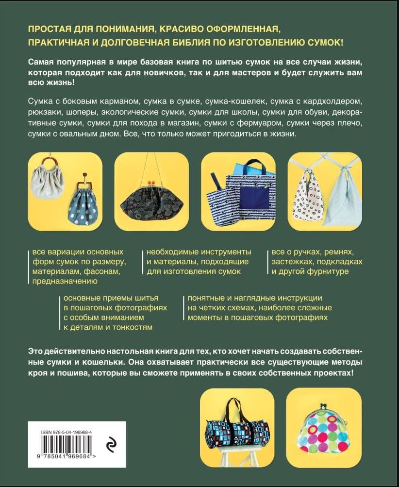 Огромное собрание выкроек практически всех фасонов сумок с вариациями размеров и материалов, с подробными инструкциями по последовательности кроя, пошива, сборки и отделки. Книга, благодаря которой вы сможете создать для себя или на заказ абсолютно любую сумку — от нарядного клатча до вместительного рюкзака!