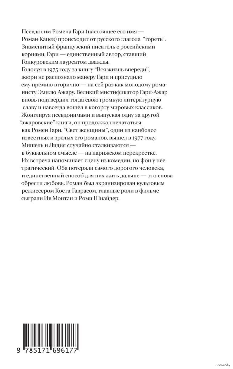 Выпуская одну за другой «ажаровские» книги, он продолжал печататься как Ромен Гари. «Свет женщины» (1977) — один из самых известных и самых пронзительных его романов о столкновении любви со смертью. Роман лег в основу фильма знаменитого Коста-Гавраса, главные роли сыграли Ив Монтан и Роми Шнайдер.