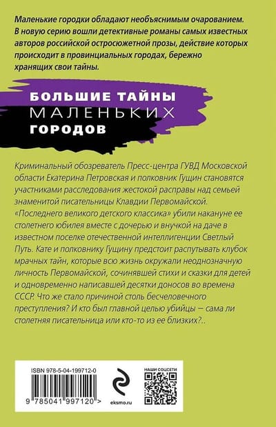 Криминальный обозреватель Пресс-центра ГУВД Московской области Екатерина Петровская вместе с полковником Гущиным становятся участниками расследования жестокой расправы над семьей знаменитой писательницы Клавдии Первомайской. «Последнего великого детского классика» убили накануне ее столетнего юбилея вместе с дочерью и внучкой на даче в известном поселке отечественной интеллигенции «Светлый путь». Кате и полковнику Гущину предстоит распутывать мрачный клубок тайн, которые всю жизнь окружали неоднозначную личность Первомайской, сочинявшей стихи и сказки для детей и одновременно написавшей десятки доносов во времена СССР. Что же стало причиной столь бесчеловечного преступления? И кто был главной целью убийцы — сама ли столетняя писательница или кто-то из ее близких?..