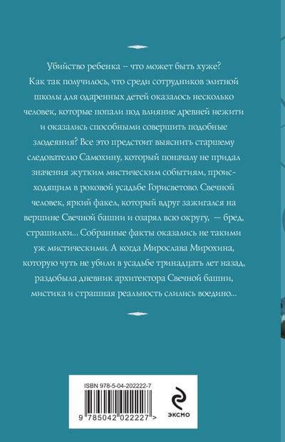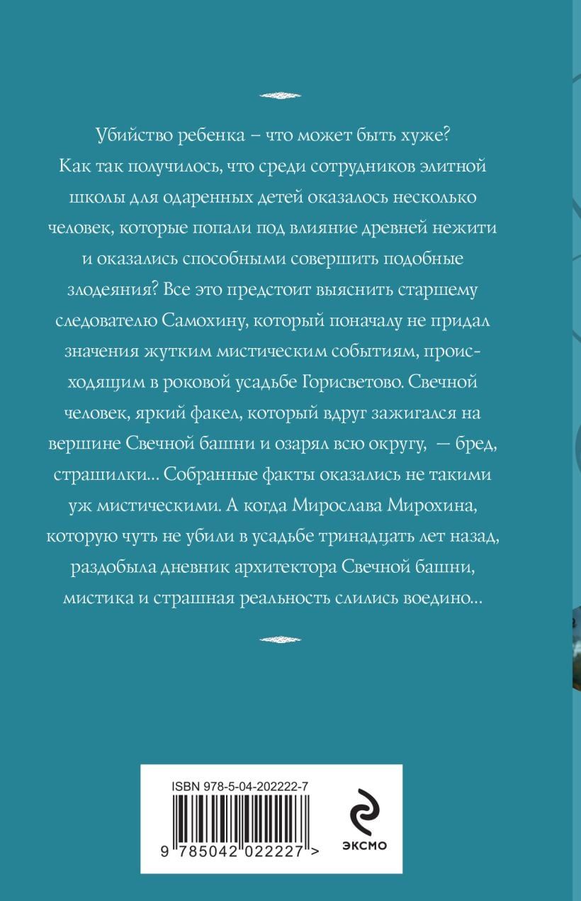 Всё это предстоит выяснить старшему следователю Самохину, который поначалу не придал значения жутким мистическим событиям, происходящем в роковой усадьбе Горисветово. Свечной человек, яркий факел, который вдруг зажигался на вершине Свечной башни, озарявший всю округу, — бред, страшилки… Собранные факты оказались не такими уж мистическими. А когда Мирослава Мирохина, которую чуть не убили в усадьбе тринадцать лет назад, раздобыла дневник архитектора Свечной башни, мистика и страшная реальность слились воедино…