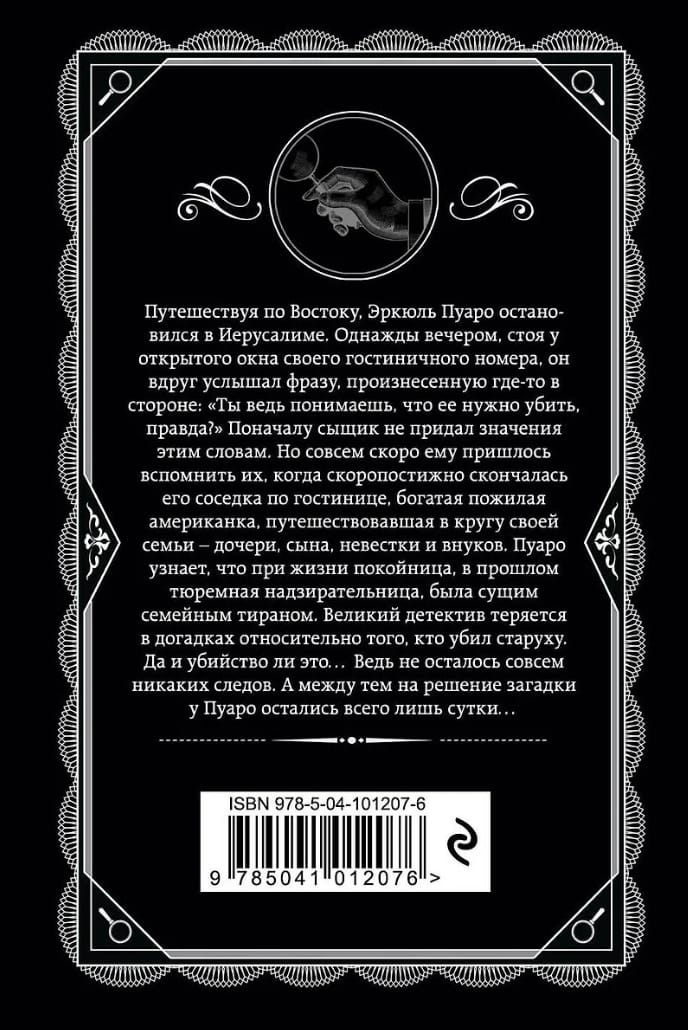Путешествуя по Востоку, Эркюль Пуаро остановился в Иерусалиме. Однажды вечером, стоя у открытого окна своего гостиничного номера, он вдруг услышал фразу, произнесенную где-то в стороне: "Ты ведь понимаешь, что ее нужно убить, правда?". Поначалу сыщик не придал значения этим словам. Но совсем скоро ему пришлось вспомнить их, когда скоропостижно скончалась его соседка по гостинице, богатая пожилая американка, путешествовавшая в кругу своей семьи – дочери, сына, невестки и внуков. Пуаро узнает, что при жизни покойница, в прошлом тюремная надзирательница, была сущим семейным тираном. Великий детектив теряется в догадках относительно того, кто убил старуху. Да и убийство ли это… Ведь не осталось совсем никаких следов. А между тем на решение загадки у Пуаро остались всего лишь сутки…