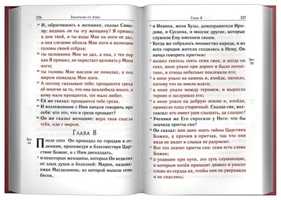 Святое Евангелие крупным шрифтом с выделением слов Спасителя красным цветом, что является удобным решением для восприятия священного текста. Издание большого формата напечатано на русском языке, содержит церковные зачала и заставки с изображениями Евангелистов. Использован твердый переплет с тиснением золотой фольгой, качественная офсетная бумага.