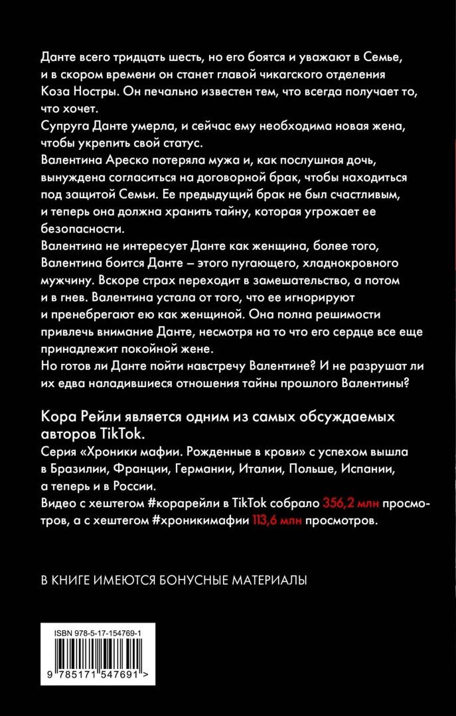 Данте всего тридцать шесть, но его боятся и уважают в Семье, и в скором времени он станет главой чикагской отделения Коза Ностры. Он печально известен тем, что всегда получает то, что хочет. Супруга Данте умерла, и сейчас ему необходима новая жена, чтобы укрепить свой статус.Валентина Ареско потеряла мужа и как послушная дочь вынуждена согласиться на договорной брак, чтобы находиться под защитой Семьи. Ее предыдущий брак не был счастливым и теперь она вынуждена хранить тайну, которая угрожает ее безопасности. Валентина не интересует Данте как женщина, более того, Валентина боится Данте – этого пугающего, хладнокровного мужчину. Вскоре страх переходит в замешательство, а потом и в гнев. Валентина устала от того, что ее игнорируют и пренебрегают как женщиной. Она полна решимости привлечь внимание Данте, несмотря на то, что его сердце все еще принадлежит покойной жене. Но готов ли Данте пойти на встречу Валентине? И не разрушат ли их едва наладившиеся отношения тайны прошлого Валентины?