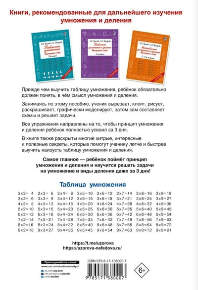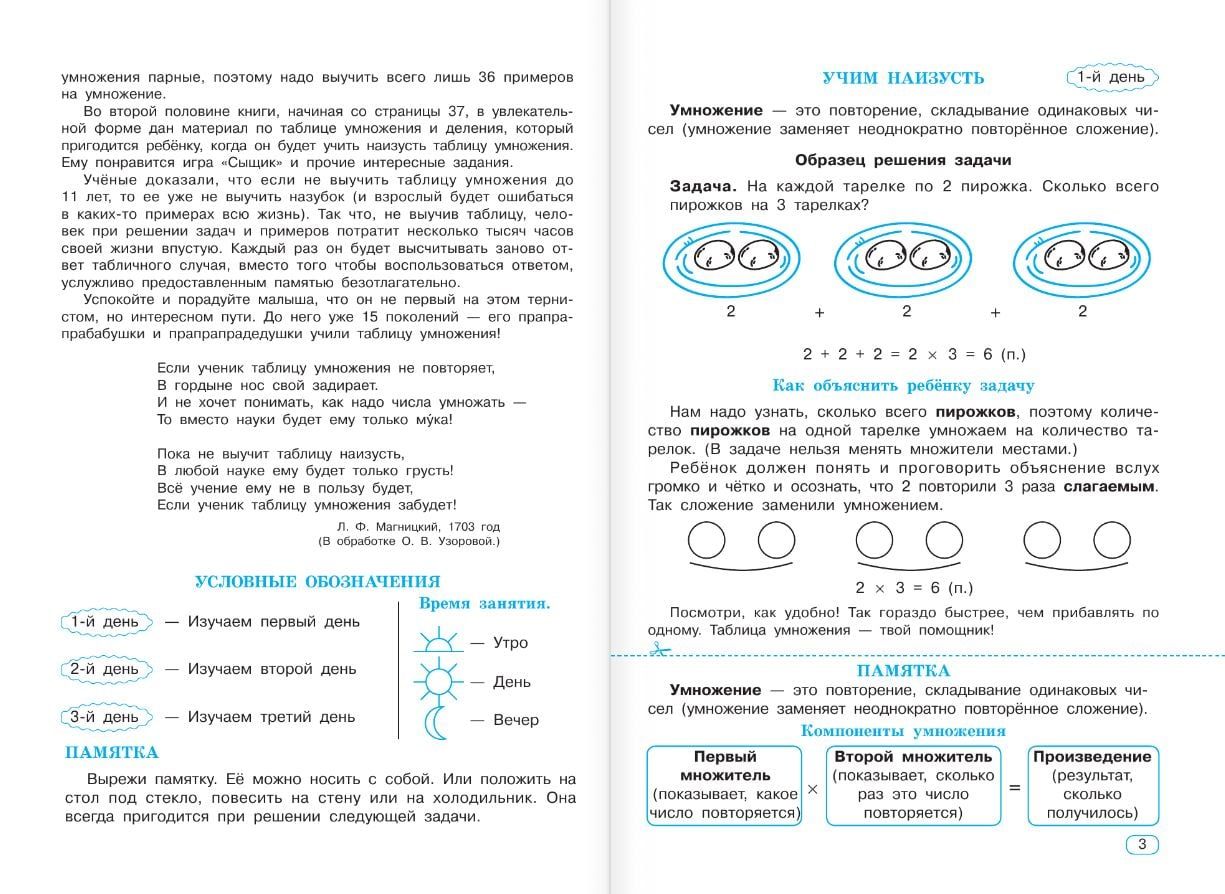 «Таблица умножения за 3 дня» — это комплекс развивающих упражнений, который поможет ребёнку за короткий срок выучить таблицу умножения и отработать полученные знания на практике. Благодаря уникальной авторской методике О. В. Узоровой младшие школьники смогут без труда освоить трудный материал, потренируются умножать и делить простые числа.