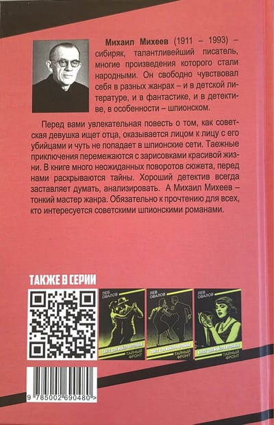 Михаил Михеев (1911 – 1993) – сибиряк, талантливейший писатель, многие произведения которого стали народными. Он свободно чувствовал себя в разных жанрах – и в детской литературе, и в фантастике, и в детективе, в особенности –шпионском. Перед вами увлекательная повесть о том, как советская девушка ищет отца, оказывается лицом к лицу с его убийцами и чуть не попадает в шпионские сети. Таежные приключения перемежаются с зарисовками красивой жизни. В книге много неожиданных поворотов сюжета, перед нами раскрываются тайны. Хороший детектив всегда заставляет думать, анализировать. А Михаил Михеев – тонкий мастер жанра. Обязательно к прочтению для всех, кто интересуется советскими шпионскими романами.