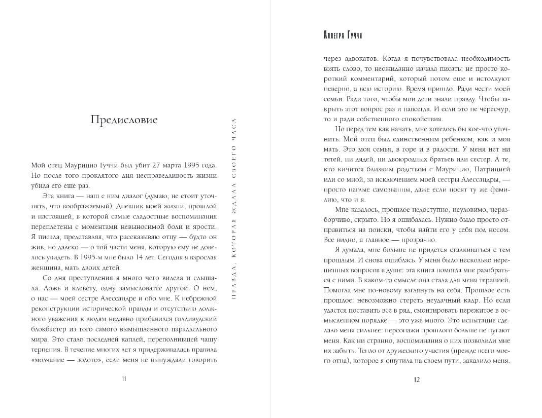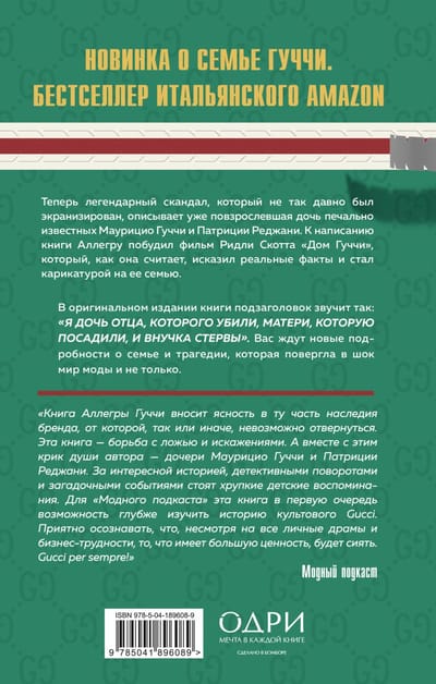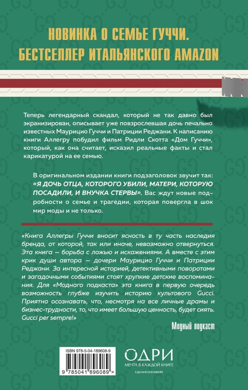 Аллегра Гуччи никогда не давала интервью и публично не обсуждала убийство своего отца Маурицио Гуччи, заказчиком которого была признана ее мать Патриция Реджани. И, возможно, так и не нарушила бы этот своеобразный обет молчания, если бы не фильм Ридли Скотта «Дом Гуччи». Она надеялась, что лента расскажет о династии, их традициях, о создании и развитии бренда. Но сценаристы сконцентрировались на отношениях Маурицио и Патриции, создав очередной остросюжетный блокбастер. Недовольство Аллегры разделили и многие другие, в том числе дизайнер Том Форд. Так на свет появилась эта книга — история полная борьбы, скорби, надежд и разочарований.