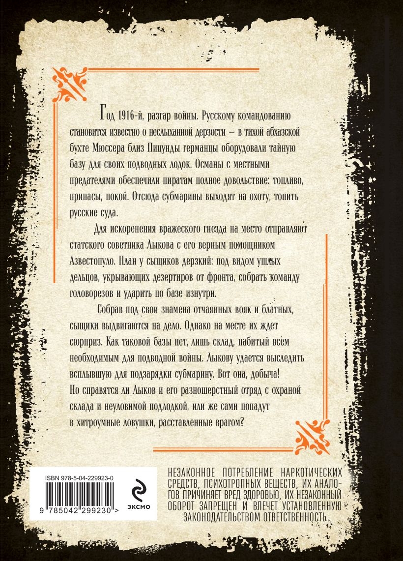 Собрав под свои знамена отчаянных вояк и блатных, сыщики выдвигаются на дело. Однако на месте их ждет сюрприз. Как таковой базы нет, лишь склад, набитый всем необходимым для подводной войны. Лыкову удается выследить всплывшую для подзарядки субмарину. Вот она, добыча! Но справятся ли Лыков и его разношерстный отряд с охраной склада и неуловимой подлодкой или же сами попадут в хитроумные ловушки, расставленные врагом?