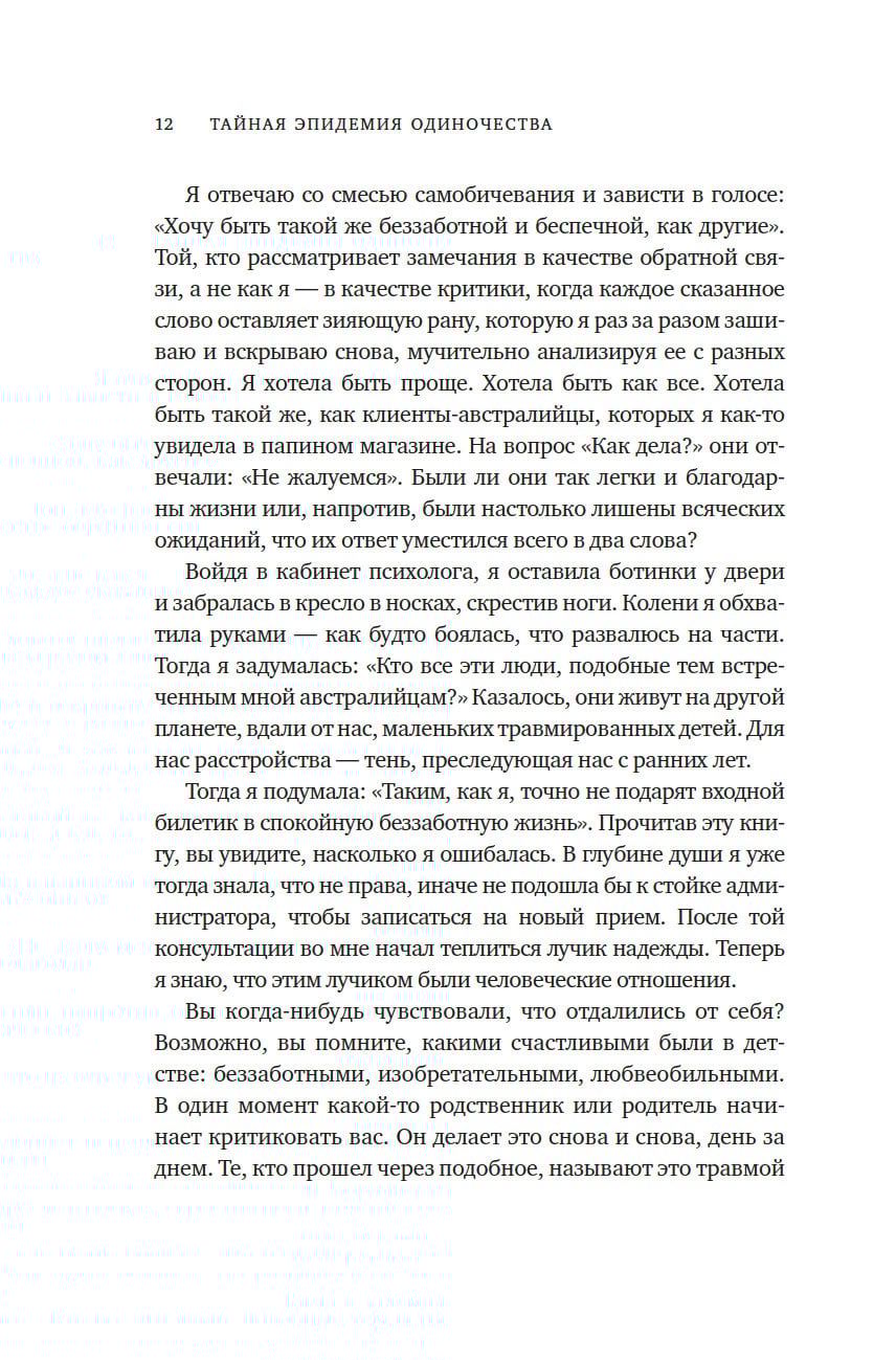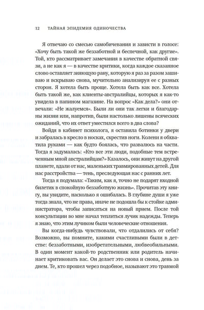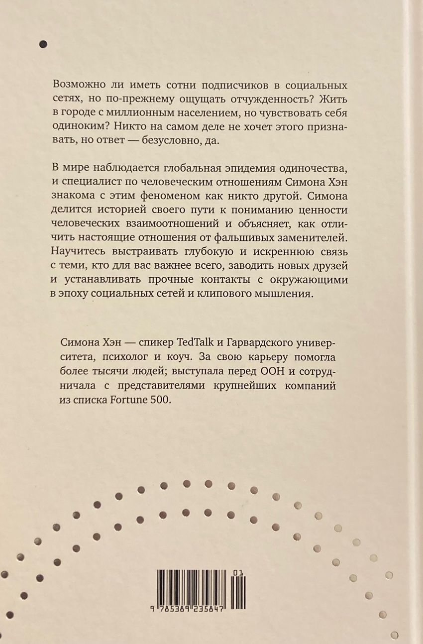 Одиночество — новая эпидемия XXI века, которая незаметно проникла в каждый уголок мира. Прислушайтесь к себе: как часто среди информационного шума повседневности вы обнаруживаете себя в совершенной изоляции? В этой книге психолог и коуч Симона Хэн, переплетая личные истории с подкрепленными фактами исследованиями и практическими упражнениями, дарит возможность каждому дать отпор одиночеству, преодолеть отчужденность и предпринять активные шаги к построению глубоких, полноценных отношений.