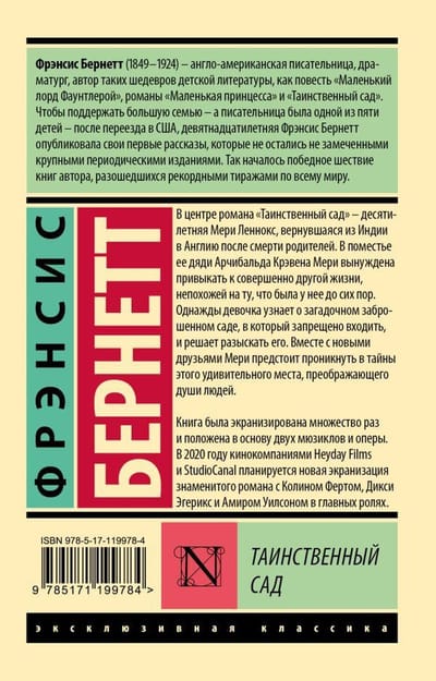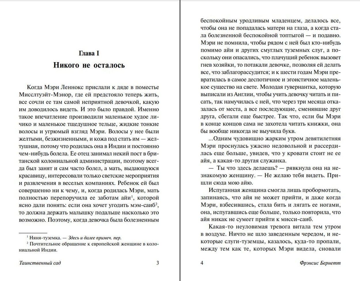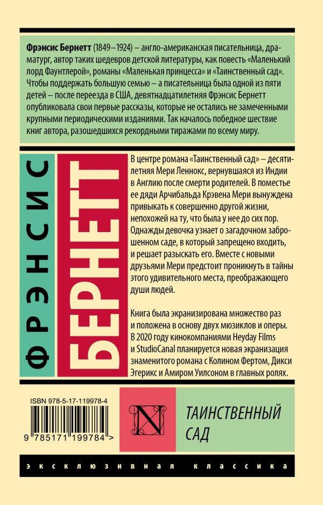 В центре романа «Таинственный сад» – десятилетняя Мери Леннокс, вернувшаяся из Индии в Англию после смерти родителей. В поместье ее дяди Арчибальда Крэвена Мери вынуждена привыкать к совершенно другой жизни, непохожей на ту, что была у нее до сих пор. Однажды девочка узнает о загадочном заброшенном саде, в который запрещено входить, и решает разыскать его. Вместе с новыми друзьями Мери предстоит проникнуть в тайны этого удивительного места, преображающего души людей.