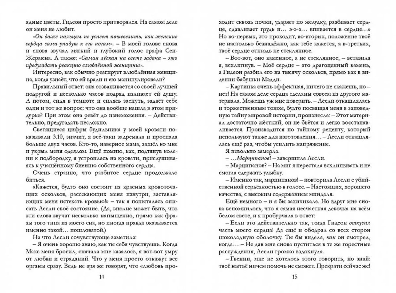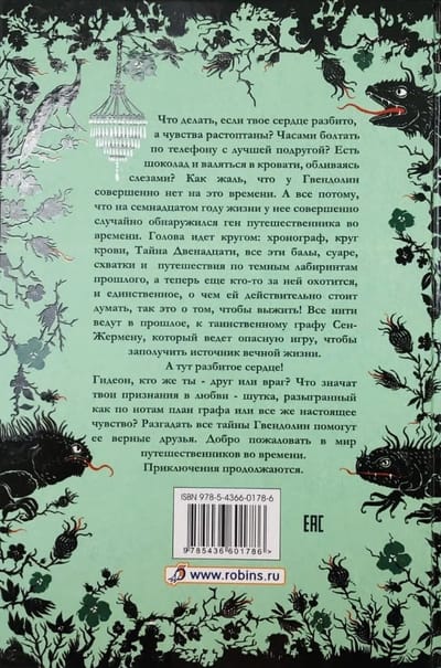 Что делать, если твое сердце разбито, а чувства растоптаны? Часами болтать по телефону с лучшей подругой? Есть шоколад и валяться в кровати, обливаясь слезами? Как жаль, что у Гвендолин совершенно нет на это времени. А все потому, что на семнадцатом году жизни у нее совершенно случайно обнаружился ген путешественника во времени. Голова идет кругом: хронограф, круг крови, Тайна Двенадцати, все эти балы, суаре, схватки и путешествия по темным лабиринтам прошлого, а теперь еще кто-то за ней охотится, и единственное, о чем ей действительно стоит думать, так это о том, чтобы выжить! Все нити ведут в прошлое, к таинственному графу Сен-Жермену, который ведет опасную игру, чтобы заполучить источник вечной жизни. А тут разбитое сердце! Разгадать все тайны Гвендолин помогут ее верные друзья. Добро пожаловать в мир путешественников во времени, приключения начинаются.