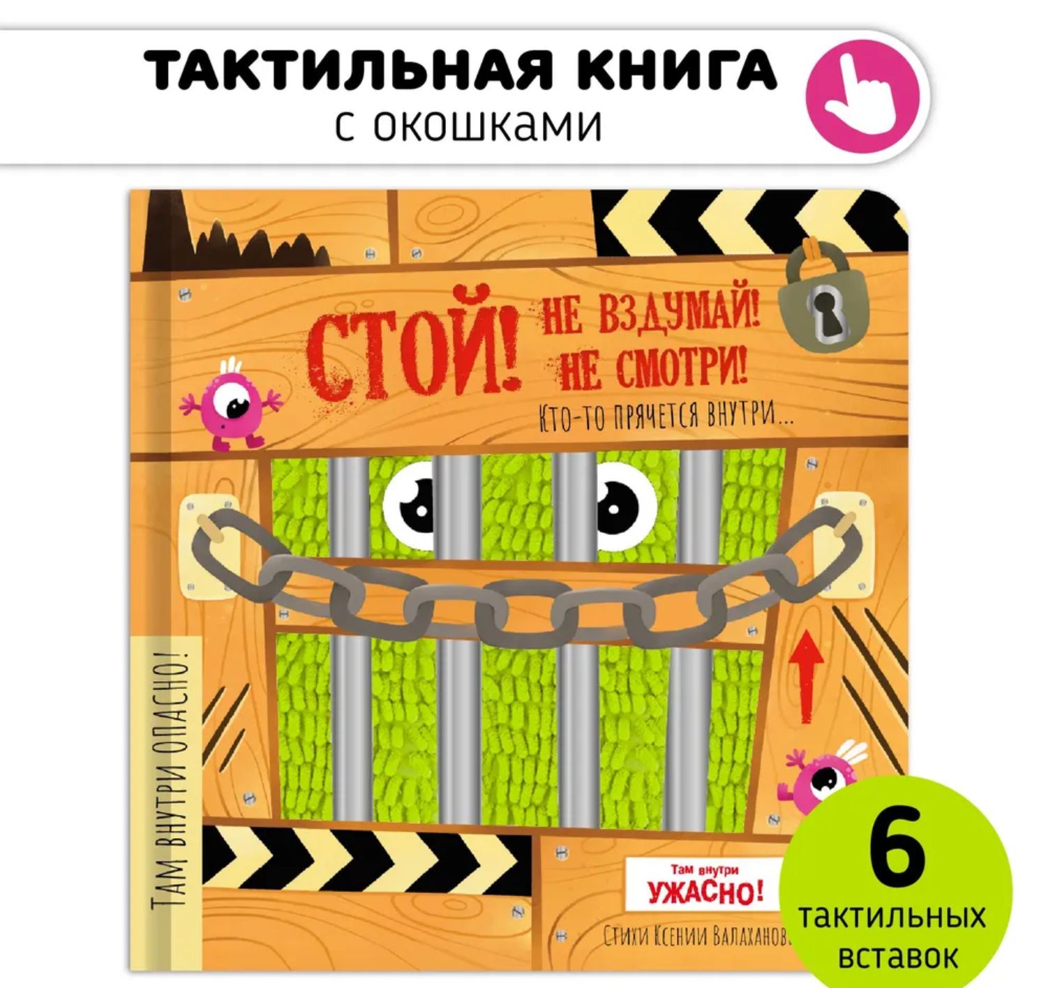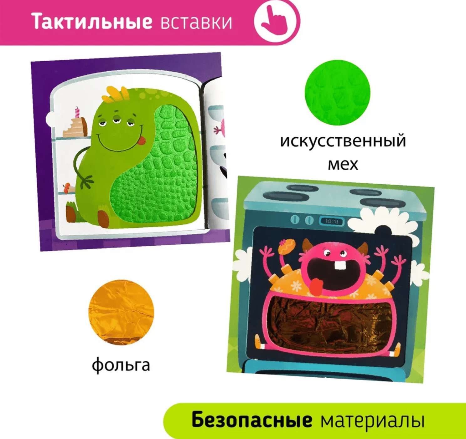 Тактильные вставки «Монстров» особенно ценят наши маленькие читатели. Они выполнены из ткани, меха, фольги, винила, ПВХ и блесток. Последние стали любимыми у детей и родителей.