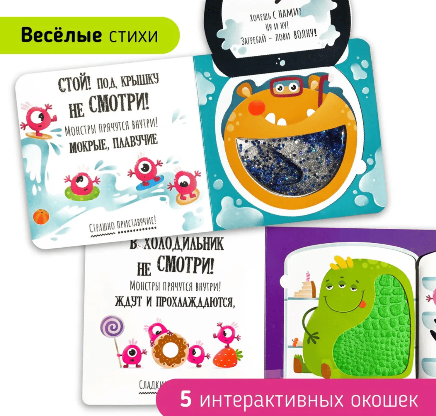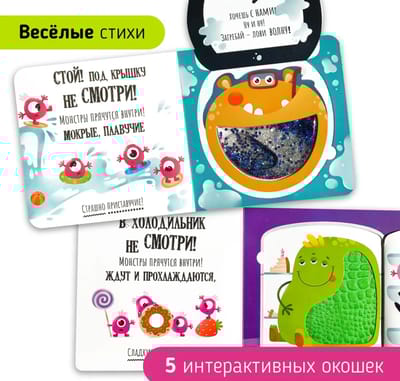 На каждой странице вас ждет доброе стихотворение и призыв открыть яркое окошко, за которым прячется прелестный монстр с мягким животиком.