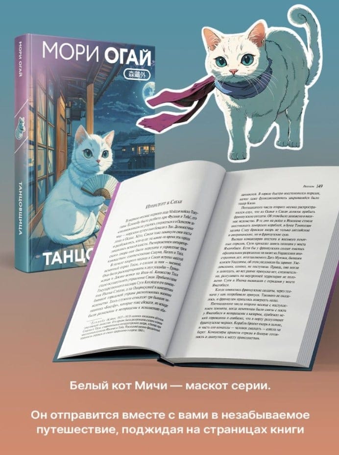 Белый кот Мичи — маскот серии. Вместе с вами он оправится в книжное путешествие по странам Азии: от чарующей Японии до загадочного Тайваня. Мичи будет поджидать вас на страницах книги. Вместе с ним вы разделите впечатления от прочитанного. На память о путешествии Мичи подарит коллекционную закладку.