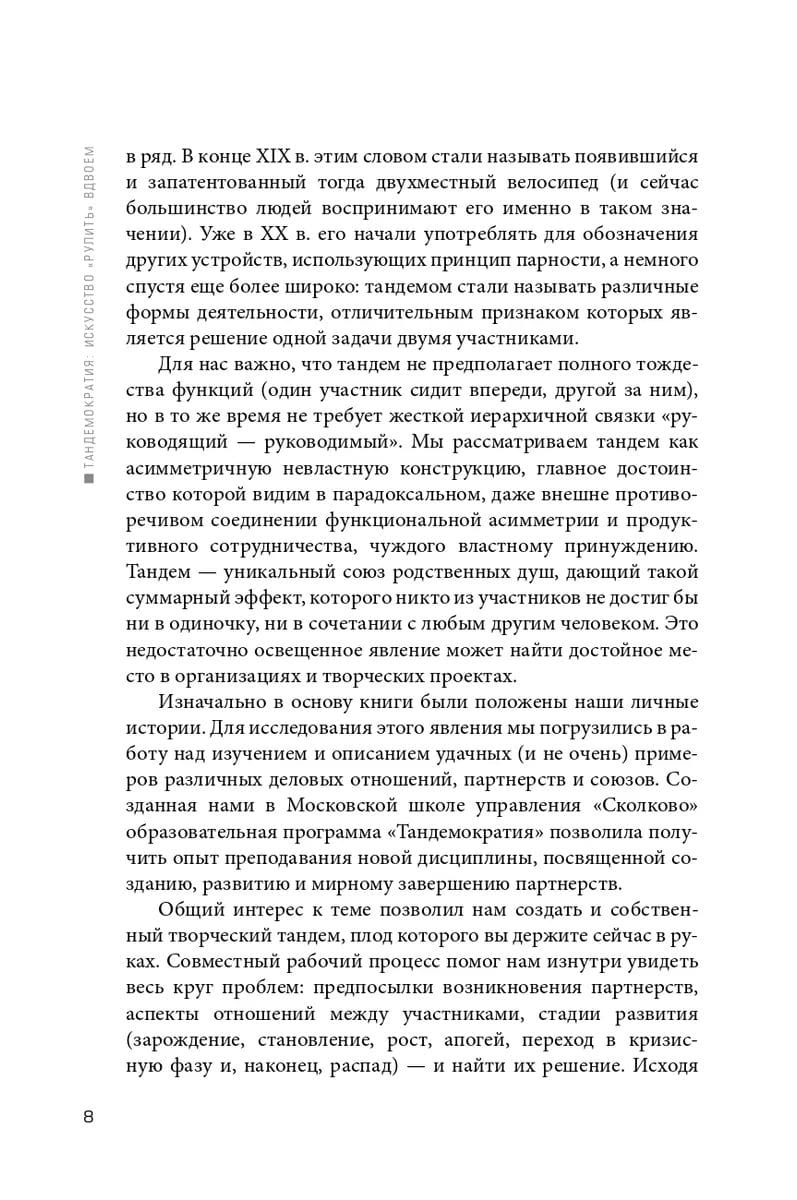 Эта книга рассказывает о том, что масштабирование идей не реализуется в одиночку, а единоличное лидерство — это миф. Все, что происходит в бизнес-среде, рассматривается авторами применительно не к одному человеку, прокладывающему себе путь, а к двум людям, соединенным особыми отношениями, — к тандему.