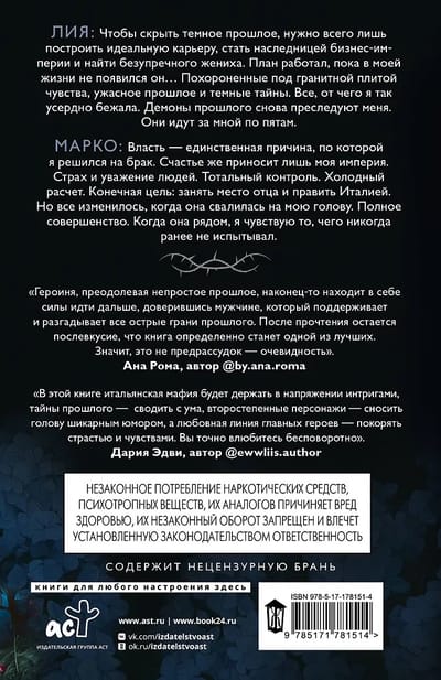 Лия: Чтобы скрыть темное прошлое, нужно всего лишь построить идеальную карьеру, стать наследницей бизнес-империи и найти безупречного жениха. План работал, пока в моей жизни не появился он… Похороненные под гранитной плитой чувства, ужасное прошлое и темные тайны. Все, от чего я так усердно бежала. Демоны прошлого снова преследуют меня. Они идут за мной по пятам.