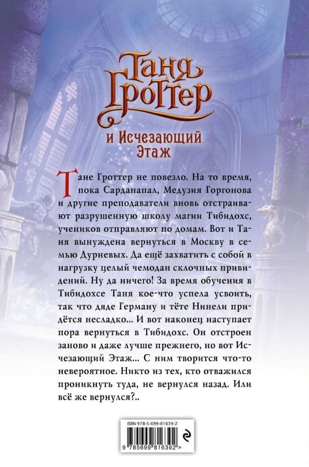 Тане Гроттер не повезло. На то время, пока Сарданапал, Медузия Горгонова и другие преподаватели вновь отстраивают разрушенную школу магии Тибидохс, учеников отправляют по домам. Вот и Таня вынуждена вернуться в Москву в семью Дурневых. Да еще захватить с собой в нагрузку целый чемодан склочных привидений. Ну да ничего! За время обучения в Тибидохсе Таня кое-что успела усвоить, так что дяде Герману и тете Нинели придется несладко… И вот наконец наступает пора вернуться в Тибидохс. Он отстроен заново и даже лучше прежнего, но вот Исчезающий Этаж… С ним творится что-то невероятное. Никто из тех, кто отважился проникнуть туда, не вернулся назад. Или все же вернулся?..