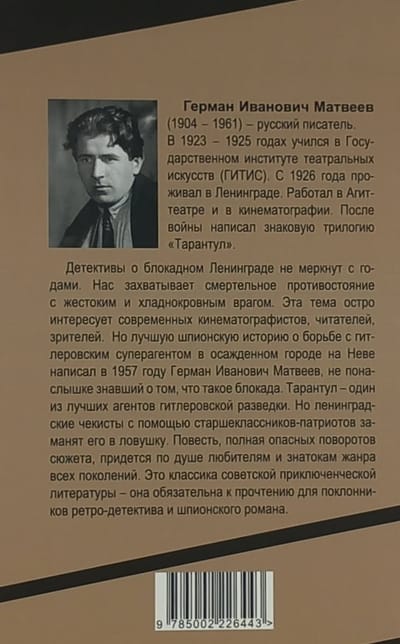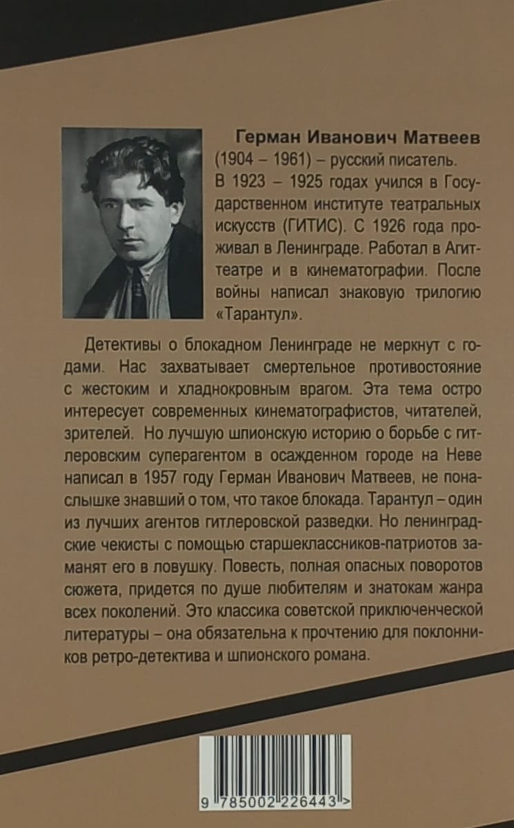 Детективы о блокадном Ленинграде не меркнут с годами. Нас захватывает смертельное противостояние с жестоким и хладнокровным врагом. Эта тема остро интересует современных кинематографистов, читателей, зрителей. Но лучшую шпионскую историю о борьбе с гитлеровским суперагентом в осажденном городе на Неве написал в 1957 году Герман Иванович Матвеев, не понаслышке знавший о том, что такое блокада. Тарантул – один из лучших агентов гитлеровской разведки. Но ленинградские чекисты с помощью старшеклассников-патриотов заманят его в ловушку. Повесть, полная опасных поворотов сюжета, придется по душе любителям и знатокам жанра всех поколений. Читайте лучший детектив о блокадном Ленинграде – о городе, который не сдавался и не склонял голову перед врагом.