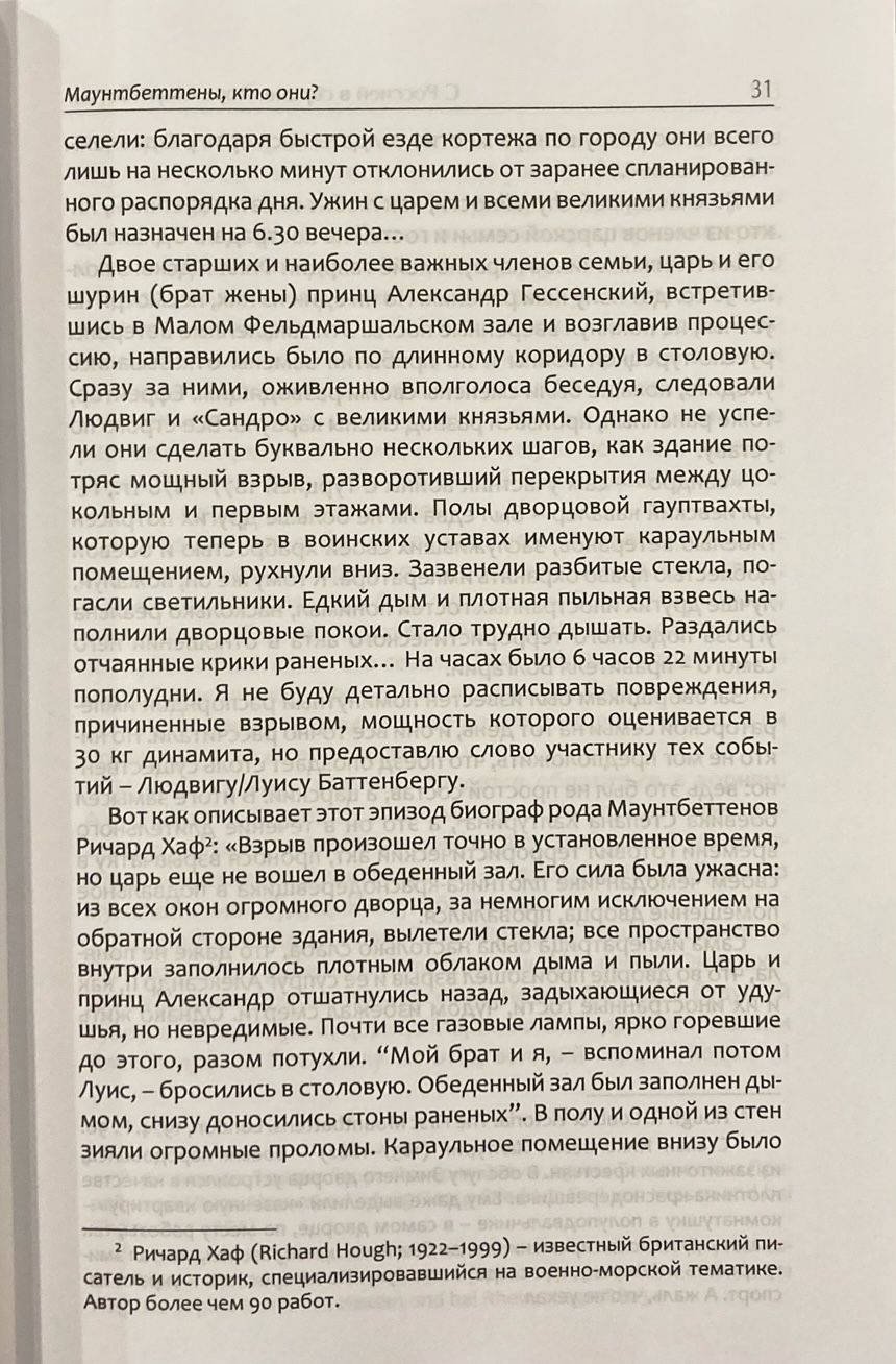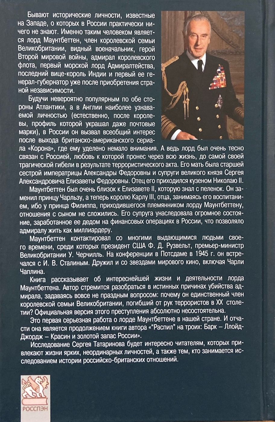 Бывают исторические личности, известные на Западе, о которых в России практически ничего не знают. Именно таким человеком является лорд Маунтбеттен, член королевской семьи Великобритании, видный военачальник, герой Второй мировой войны, адмирал королевского флота, первый морской лорд Адмиралтейства, последний вице-король Индии и первый ее генерал-губернатор уже после приобретения страной независимости. Будучи невероятно популярным по обе стороны Атлантики, а в Англии наиболее узнаваемой личностью (естественно, после королевы, профиль которой украшал даже почтовые марки), в России он вызвал всеобщий интерес после выхода британско-американского сериала «Корона», где ему уделено немало внимания. А ведь лорд был очень тесно связан с Россией, любовь к которой пронес через всю жизнь, до самой своей трагической гибели в результате террористического акта. Его мать была старшей сестрой императрицы Александры Федоровны и супруги великого князя Сергея Александровича Елизаветы Федоровны. Отец его приходился кузеном Николаю II. Маунтбеттен был очень близок к Елизавете II, которую знал с пеленок. Он заменил принцу Чарльзу, а теперь королю Карлу III, отца, занимаясь его воспитанием, ибо у принца Филиппа, приходившегося племянником лорду Маунтбеттену, отношения с сыном не сложились. Его супруга унаследовала огромное состояние, заработанное ее дедом на финансовых операциях в России, что позволяло адмиралу жить как миллиардеру. Маунтбеттен контактировал со многими выдающимися людьми своего времени, среди которых президент США Ф. Д. Рузвельт, премьер-министр Великобритании У. Черчилль. На конференции в Потсдаме в 1945 г. он встречался с И. В. Сталиным. Дружил и со звездами мирового кино, включая Чарли Чаплина. Книга рассказывает об интереснейшей жизни и деятельности лорда Маунтбеттена. Автор стремится разобраться в истинных причинах убийства адмирала, задаваясь вовсе не праздным вопросом: почему он единственный член королевской семьи Великобритании, погибший от рук террористов в ХХ столетии? Официальная версия этого преступления абсолютно несостоятельна. Это первая серьезная работа о лорде Маунтбеттене в нашей стране. И отчасти она является продолжением книги автора «Распил» на троих: Барк –Ллойд-Джордж – Красин и золотой запас России». Исследование Сергея Татаринова будет интересно читателям, которых привлекают жизни ярких, неординарных личностей, а также тем, кто занимается исследованием истории российско-британских отношений.