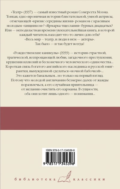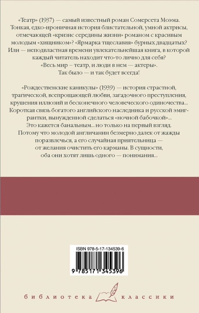 Самый известный роман Сомерсета Моэма. Тонкая, едко-ироничная история блистательной, умной актрисы, отмечающей "кризис середины жизни" романом с красивым молодым "хищником"? "Ярмарка тщеславия" бурных двадцатых? Или — неподвластная времени увлекательнейшая книга, в которой каждый читатель находит что-то лично для себя? "Весь мир – театр, и люди в нем — актеры!" Так было — и так будет всегда!  "Рождественские каникулы" (1939). История страстной, трагической, всепрощающей любви, загадочного преступления, крушения иллюзий и бесконечного человеческого одиночества…Короткая связь богатого английского наследника и русской эмигрантки, вынужденной сделаться "ночной бабочкой"…Это кажется банальным… но только на первый взгляд. Потому что молодой англичанин безмерно далек от жажды поразвлечься, а его случайная приятельница — от желания очистить его карманы. В сущности, оба они хотят лишь одного — понимания…