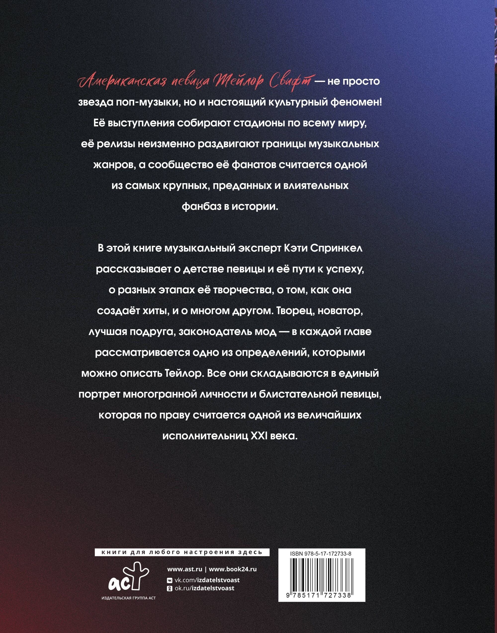 В этой книге музыкальный эксперт Кэти Спринкел рассказывает о детстве певицы и её пути к успеху, о разных этапах её творчества, о том, как она создаёт хиты, и о многом другом. Творец, новатор, лучшая подруга, законодатель мод — в каждой главе рассматривается одно из определений, которыми можно описать Тейлор. Все они складываются в единый портрет многогранной личности и блистательной певицы, которая по праву считается одной из величайших исполнительниц XXI века.