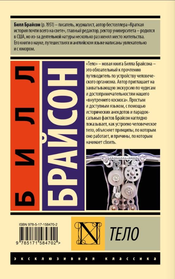 «Тело» — новая книга Билла Брайсона — это обязательный к прочтению путеводитель по устройству человеческого организма. Автор приглашает на захватывающую экскурсию по чудесам и достопримечательностям нашего «внутреннего космоса». Простым и доступным языком, с помощью исторических анекдотов и парадоксальных фактов Брайсон наглядно показывает, как устроено человеческое тело, объясняет принципы, по которым оно работает, и причины, по которым начинает сбоить.