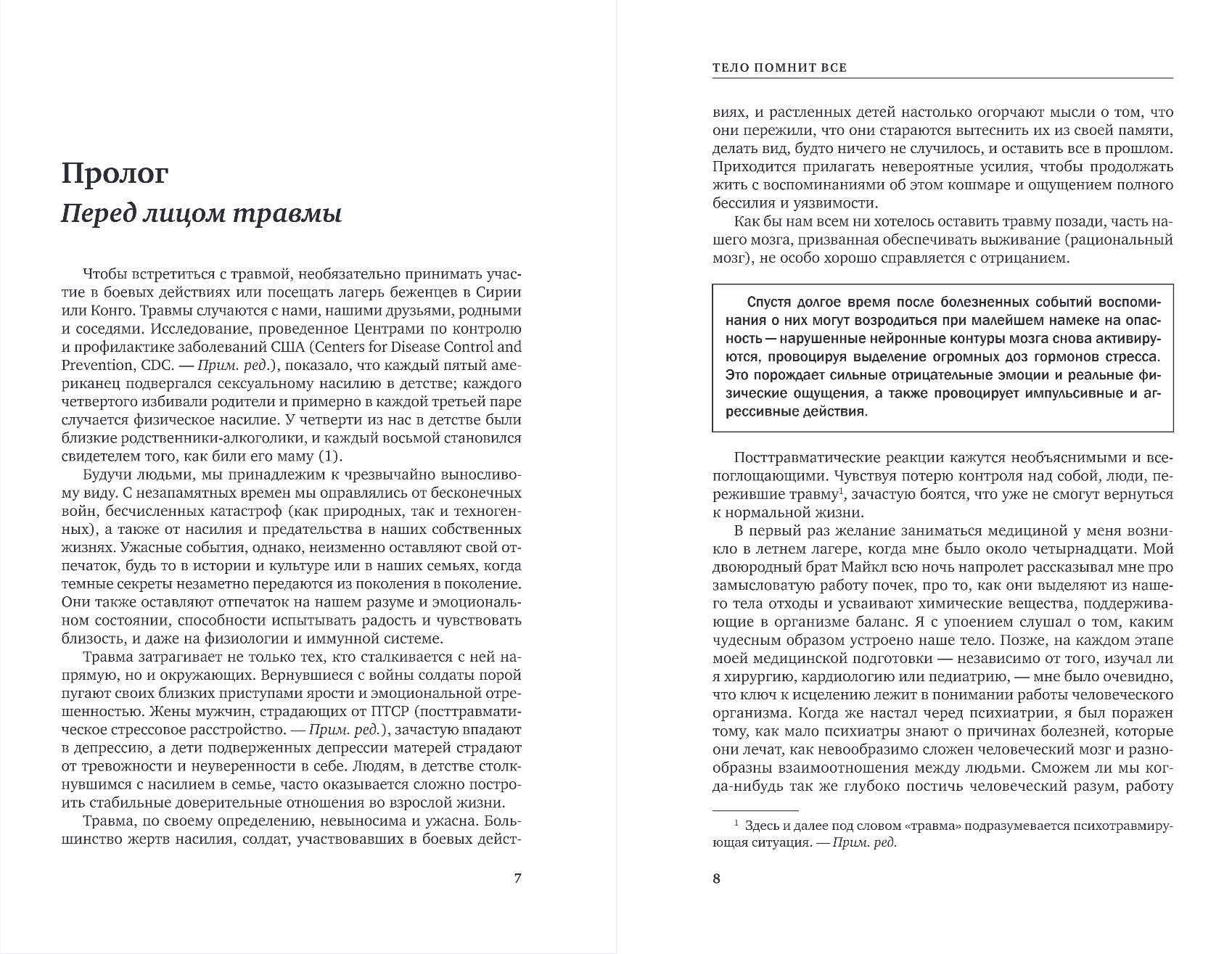 Психологическая травма нарушает нашу способность доверять внутренним чувствам, и это недоверие заставляет нас ошибочно воспринимать угрозу там, где ее нет. Травма отражается на нашем разуме и эмоциональном состоянии, способности испытывать радость и чувствовать близость и даже на физиологии и иммунной системе.