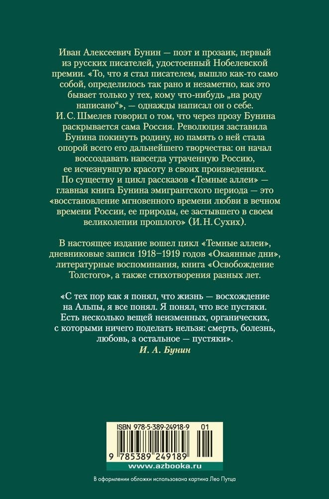 Иван Алексеевич Бунин — поэт и прозаик, первый из русских писателей, удостоенный Нобелевской премии. «То, что я стал писателем, вышло как-то само собой, определилось так рано и незаметно, как это бывает только у тех, кому что-нибудь «на роду написано», — однажды написал он о себе. И. С. Шмелев говорил о том, что через прозу Бунина раскрывается сама Россия. Революция заставила Бунина покинуть родину, но память о ней стала опорой всего его дальнейшего творчества: он начал воссоздавать навсегда утраченную Россию, ее исчезнувшую красоту в своих произведениях. По существу и цикл рассказов «Темные аллеи» — главная книга Бунина эмигрантского периода — это «восстановление мгновенного времени любви в вечном времени России, ее природы, ее застывшего в своем великолепии прошлого» (И. Н. Сухих). В настоящее издание вошел цикл «Темные аллеи», дневниковые записи 1918–1919 годов «Окаянные дни», литературные воспоминания, книга «Освобождение Толстого», а также стихотворения разных лет.