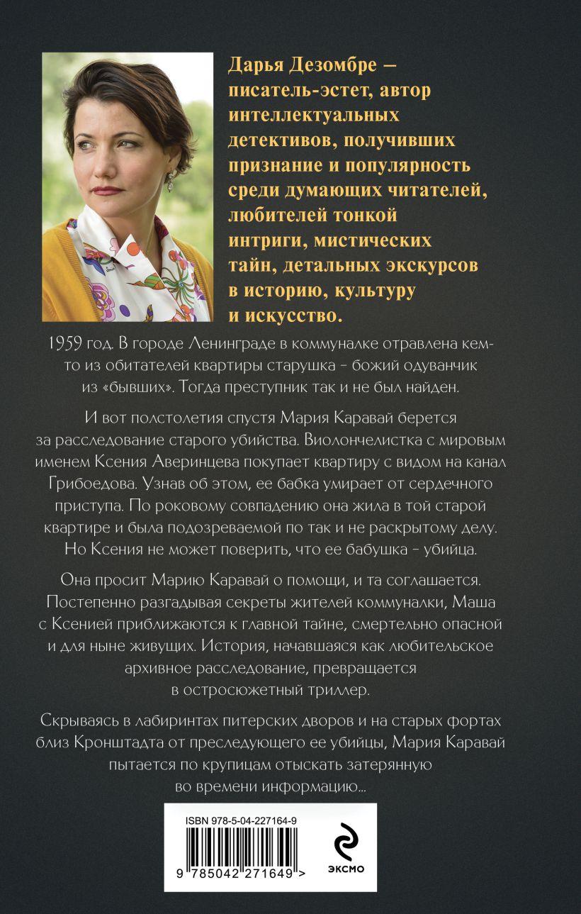 Виолончелистка с мировым именем Ксения Аверинцева покупает квартиру с видом на канал Грибоедова. Узнав об этом, ее бабка умирает от сердечного приступа. По роковому совпадению она жила в той старой квартире и была подозреваемой по так и не раскрытому делу. Но Ксения не может поверить, что ее бабушка — убийца. Она просит Марию Каравай о помощи, и та соглашается. Постепенно разгадывая секреты жителей коммуналки, Маша с Ксенией приближаются к главной тайне, смертельно опасной и для ныне живущих. История, начавшаяся как любительское архивное расследование, превращается в остросюжетный триллер. Скрываясь в лабиринтах питерских дворов и на старых фортах близ Кронштадта от преследующего ее убийцы, Мария Каравай пытается по крупицам отыскать затерянную во времени информацию...