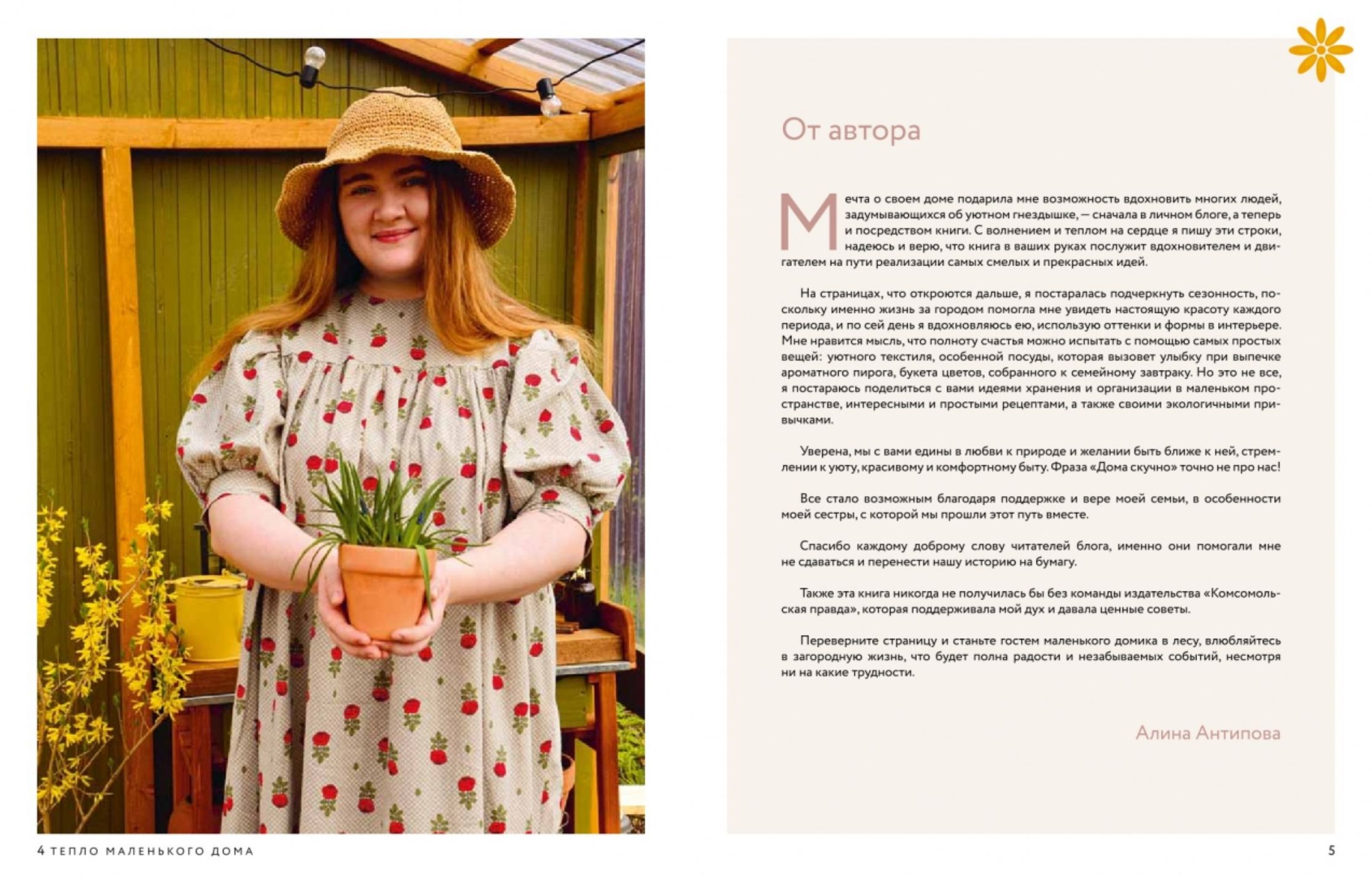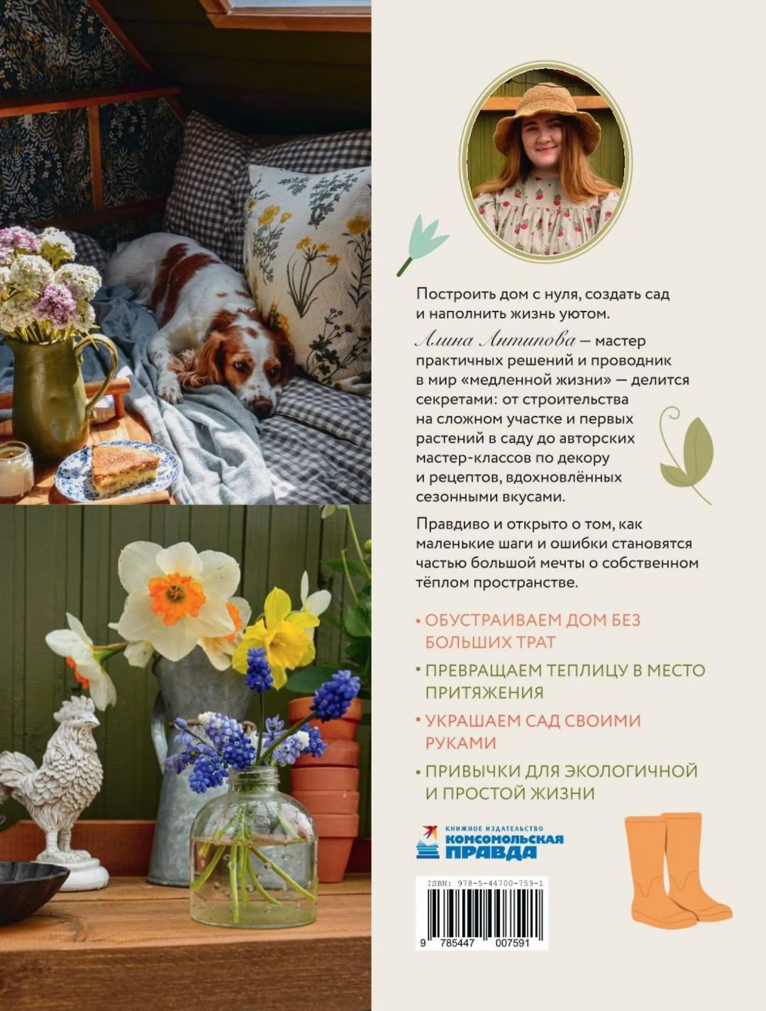 Алина Антипова, мастер практичных решений и проводник в мир «медленной жизни», делится личным опытом — о плюсах и минусах загородного быта, находках и ошибках, о том, как создать уют в ограниченном пространстве. На страницах книги — основы садоводства, растения для «ленивого сада» и готовые схемы миксбордеров. Все о теплице, включая чертежи, и о садовом декоре своими руками: кашпо, табличках, стильной бочке, опоре для роз и фанерных гусях.