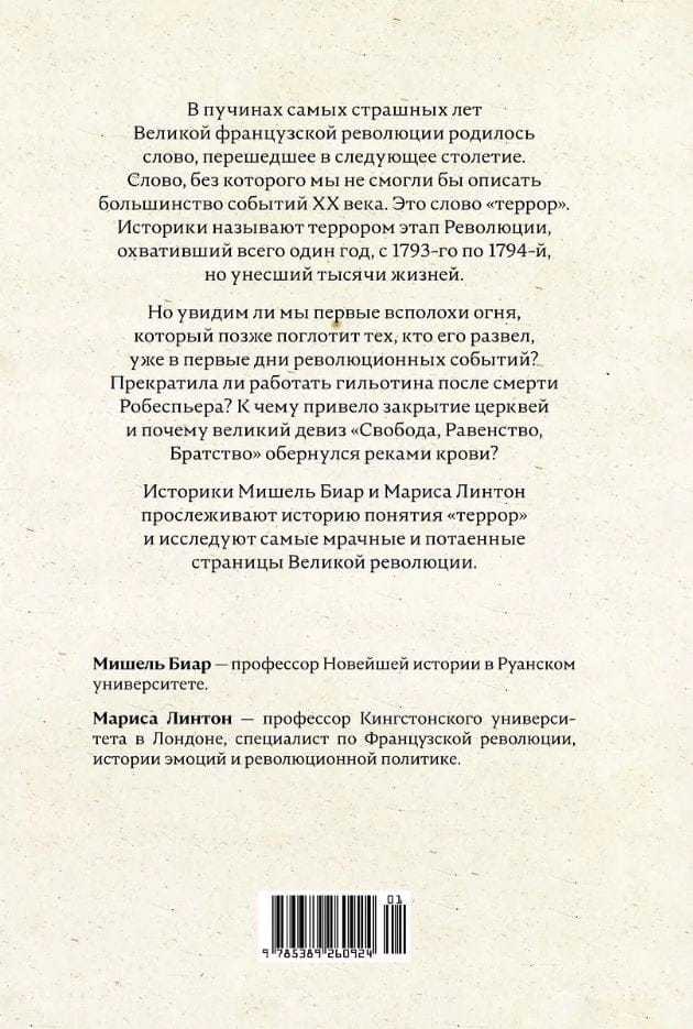Французская революция XVIII века стала парадоксом для всего мира. Борьба за права человека и свободу народоизъявления обернулась кровавыми репрессиями и массовыми казнями. Революция уравняла права граждан перед законом — и вместе с тем их шансы оказаться под лезвием гильотины. Именно этому удивительному парадоксу посвящено исследование Мишель Биар и Марисы Линтон, вместе с которыми читатель исследует самые темные события Революции — время террора. Был ли террор хаотичным порождением казней Максимилиана Робеспьера или тщательно спланированной революционной политикой? Какие философские идеи, страхи и надежды подпитывали распространение насилия среди народа и почему политики пренебрегли правами человека, начав «нарушать закон ради спасения закона»?
