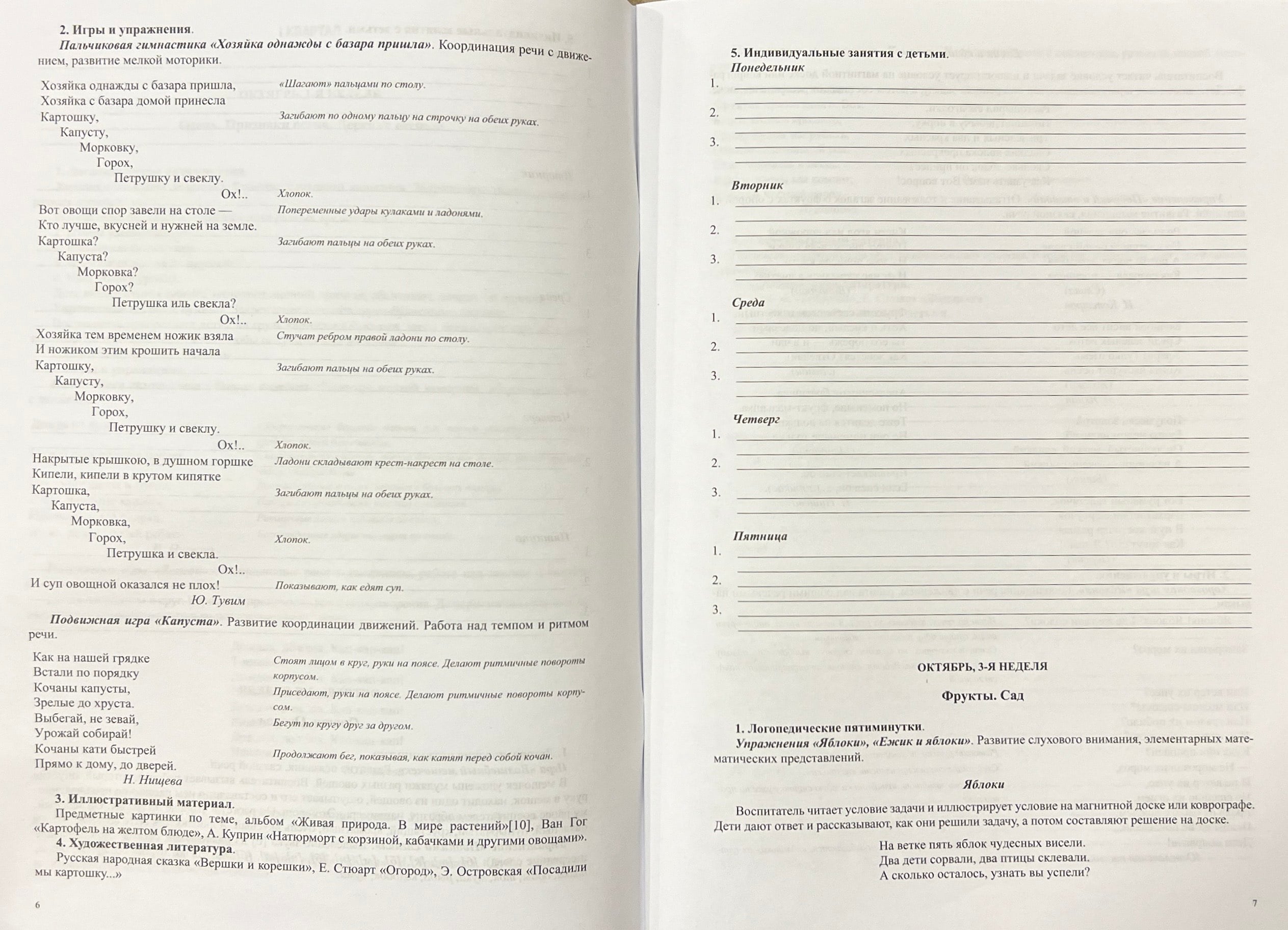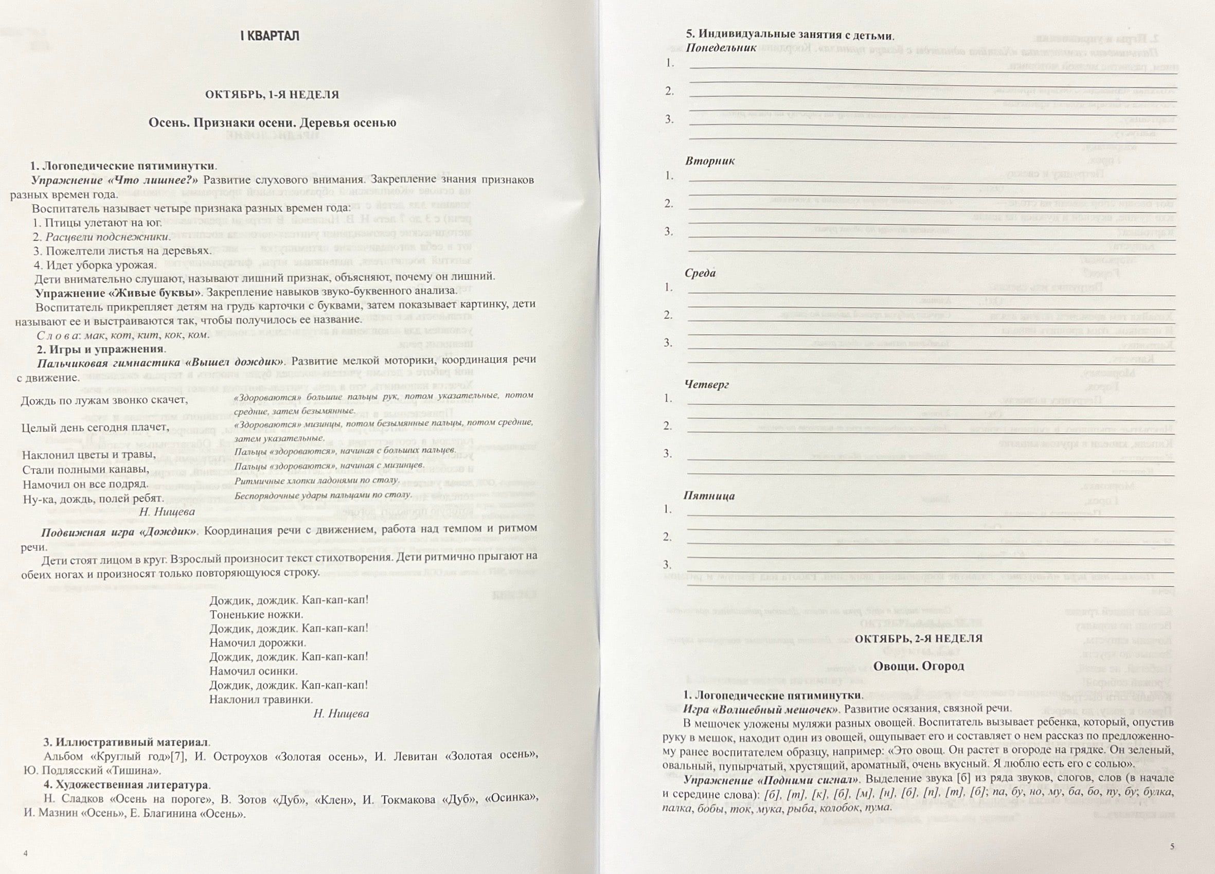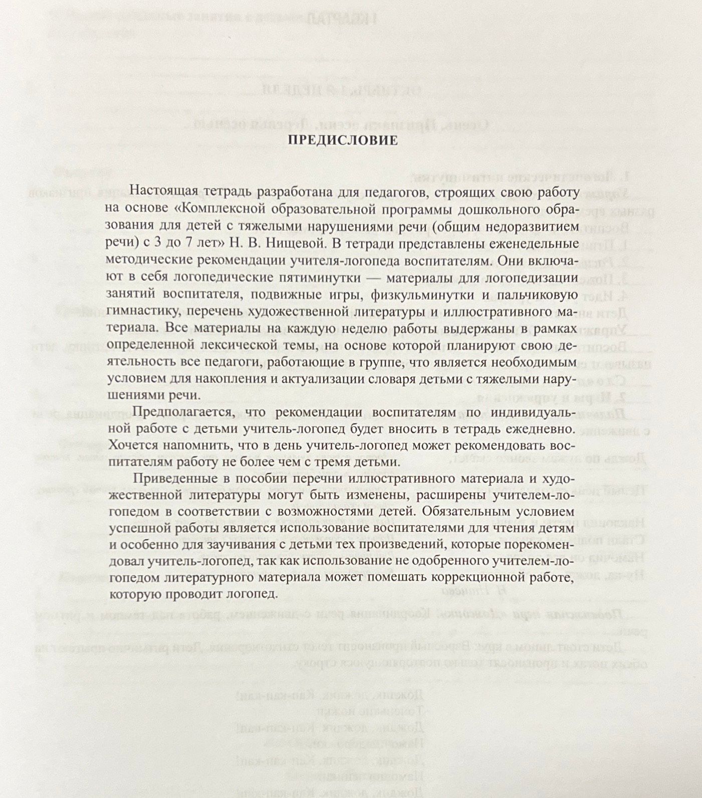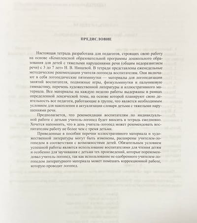 В тетради представлены еженедельные рекомендации учителя - логопеда воспитателям в старших группах ДОО, строящих свою работу на основе «Комплексной образовательной программы дошкольного образования для детей с тяжелыми нарушениями речи (общим недоразвитием речи) с 3 до 7 лет» Н. В. Нищевой. Это логопедические пятиминутки, подвижные игры, пальчиковая гимнастика, перечень наглядных материалов и литературных произведений. Все материалы на каждую неделю работы выдержаны в рамках определенной лексической темы.