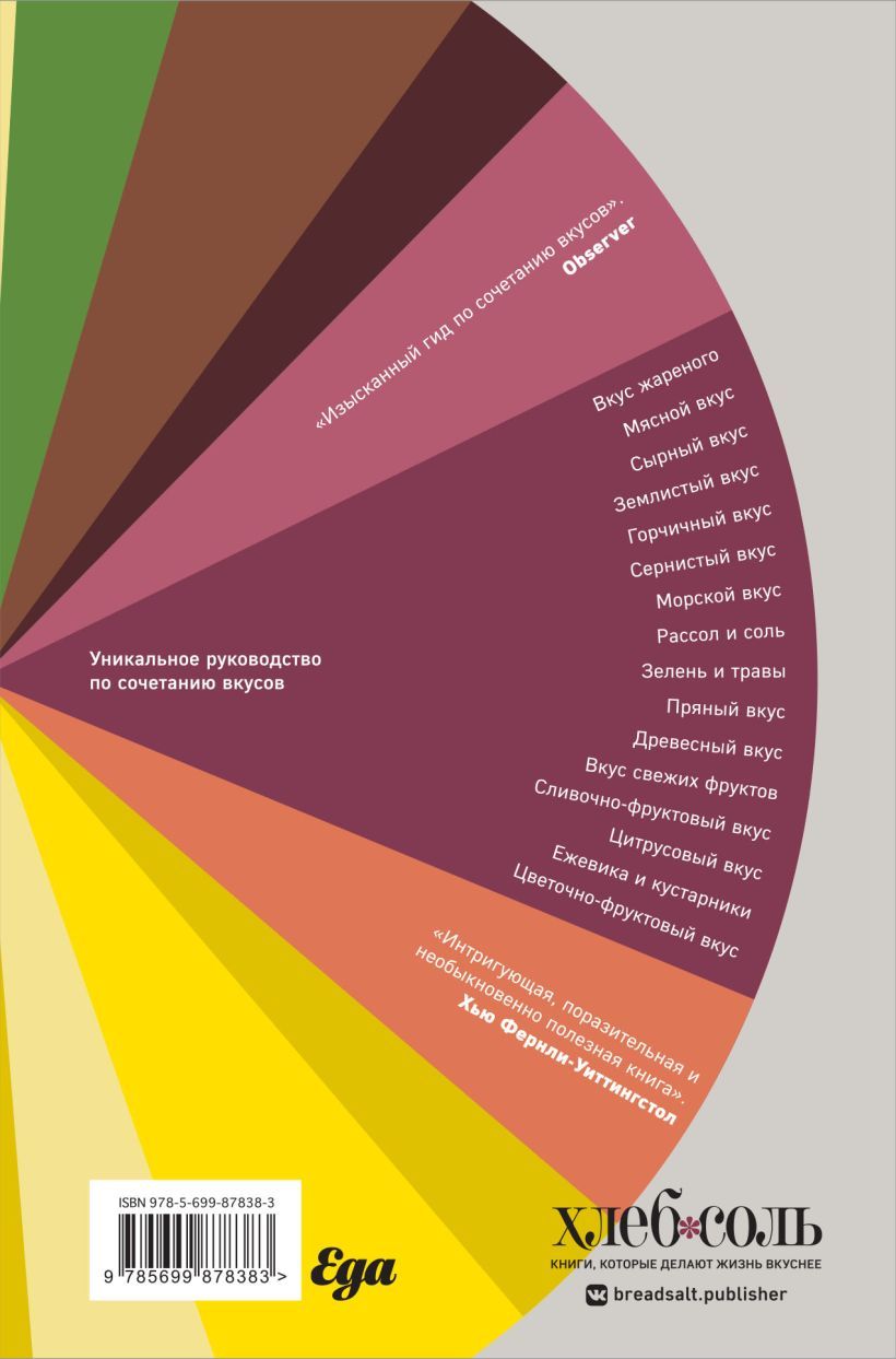 С чем сочетается ягненок? Какую приправу добавить к белой рыбе, чтоб получить оригинальное блюдо? Почему чили так прекрасно оттеняет горький шоколад? Ответы на эти вопросы интересны не только профессиональным шеф-поварам, но и новичкам, которые хотят приготовить вкусное блюдо. Ники Сегнит, в прошлом успешный маркетолог в сфере продуктов питания, решила создать полный справочник сочетаемости вкусов. «Тезаурус вкусов» — это список из 99 популярных продуктов с разными сочетаниями — классическими и менее известными. Всего 980 вкусовых пар, к 200 из них приводятся рецепты. Все ингредиенты поделены на 16 тематических групп. Например, «сырные», «морские», «жареные» и т.д. К каждому сочетанию вкусов приведена статья с кулинарным, историческим и авторским бэкграундом.