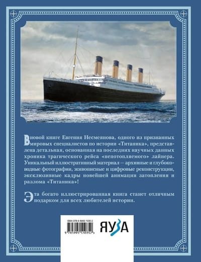 В новой книге Евгения Несмеянова, одного из признанных мировых специалистов по истории «Титаника», представлена детальная, основанная на последних научных данных хроника трагического рейса «непотопляемого» лайнера. Уникальный иллюстративный материал — архивные и глубоководные фотографии, живописные и цифровые реконструкции, эксклюзивные кадры новейшей анимации затопления и разлома «Титаника»! Эта богато иллюстрированная книга станет отличным подарком для всех любителей истории.