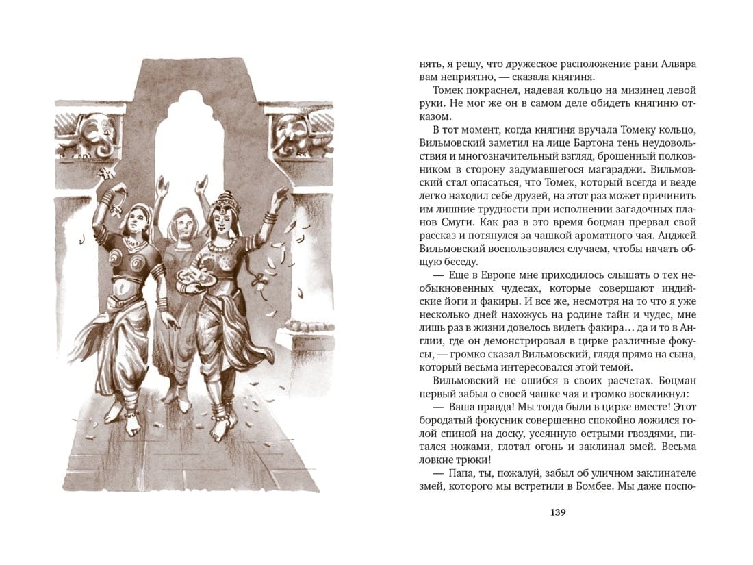 Восток — родина древнейших культур и диковинных традиций, где плодородные долины граничат с безжизненными пустынями, состоятельные люди соседствуют с нищими, а в горах по легендам обитает снежный человек. Именно в эту часть света и отправляется Томек Вильмовский. Получив письмо от Яна Смуги с просьбой о помощи, Томек с отцом и боцманом Новицким немедленно выдвигаются в Индию. Они уверены: с их товарищем приключилась беда, ведь, будучи человеком не из робкого десятка, Смуга не стал бы никого беспокоить по пустякам. Найти отважного зверолова в Бомбее путешественникам не удается, а поверенного Смуги прямо у них на глазах убивает незнакомец со шрамом на щеке. Дело принимает серьезный оборот. Что же заставило Смугу забраться в глубины Южной Азии? А главное — жив ли он?..
