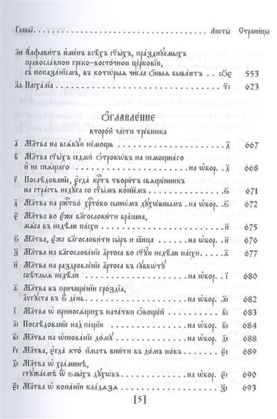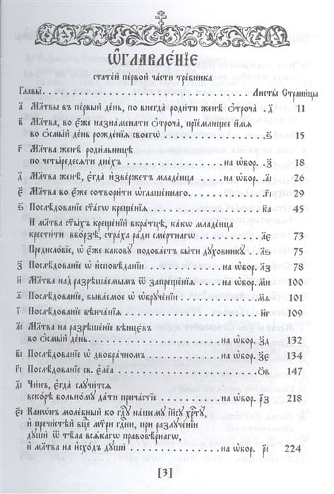 Книга получила свое название от слова «треба», которое в древнерусском языке означало «жертва», «жертвоприношение», «молитва», «исполнение священного обряда». В настоящее время словом «треба» называют молитвословия и священнодействия, совершаемые по просьбе (по потребам) одного или нескольких христиан в особых обстоятельствах их жизни. В первой части содержатся последования Таинств: Крещения, Миропомазания, Венчания (Брака), Елеосвящения, Покаяния — и других Божественных служб. Этими молитвословиями Православная Церковь встречает человека при его рождении, освящает его жизнь и напутствует его, когда он переходит в вечность. Кроме того, в этой части Требника имеются три дополнительные главы, в которых содержится месяцеслов, указатель имен святых по алфавиту и Пасхалия. Вторая часть Требника содержит молитвословия различных богослужебных и религиозно-житейских обрядов.
