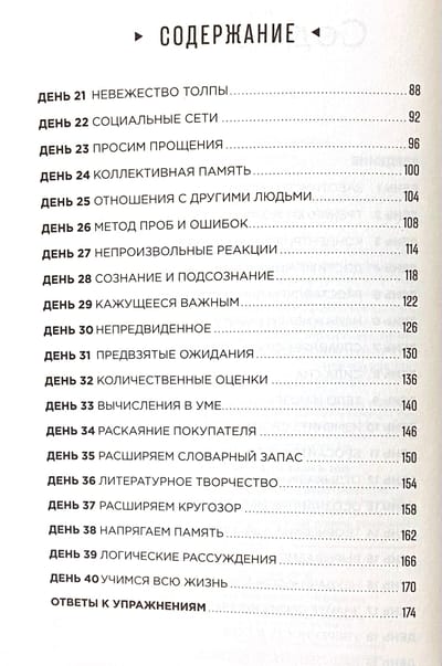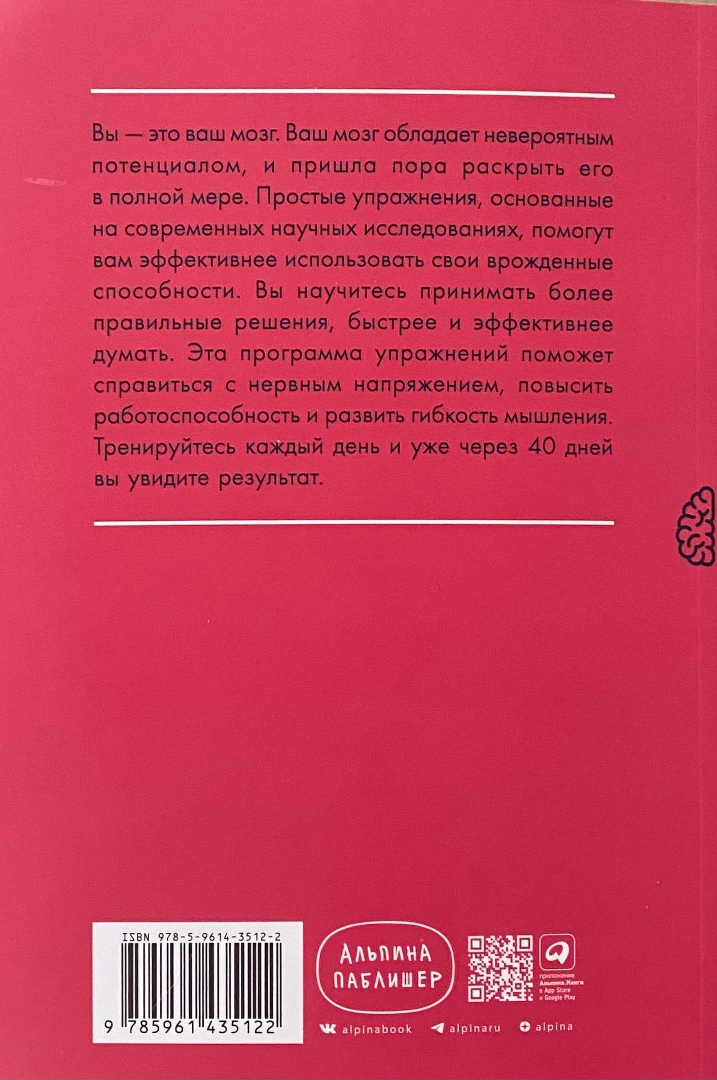 Вы — это ваш мозг. Ваш мозг обладает невероятным потенциалом, и пришла пора раскрыть его в полной мере. Простые упражнения, основанные на современных научных исследованиях, помогут вам эффективнее использовать свои врожденные способности. Вы научитесь принимать более правильные решения, быстрее и эффективнее думать. Эта программа упражнений поможет справиться с нервным напряжением, повысить работоспособность и развить гибкость мышления. Тренируйтесь каждый день, и уже через 40 дней вы увидите результат.