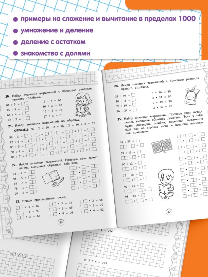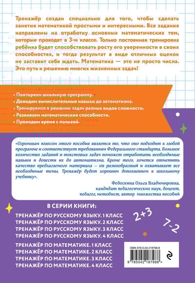 Пособие от издательства «Эксмо», соответствующее ФГОС, разработано специалистом с многолетним опытом работы и станет отличным помощником для учеников 3 класса в отработке умений и навыков, полученных на уроках математики. Решение большого количества примеров и задач на сложение и вычитание в пределах 1000, умножение и деление, деление с остатком, знакомство с долями даст возможность школьникам в дальнейшем избежать вычислительных ошибок и довести навыки счёта до автоматизма. Занимаясь по книге, учащиеся научатся анализировать информацию и понимать учебную задачу, а также смогут закрепить пройденный материал, восполнить пробелы в знаниях, развить математические способности, повысить успеваемость по предмету.
