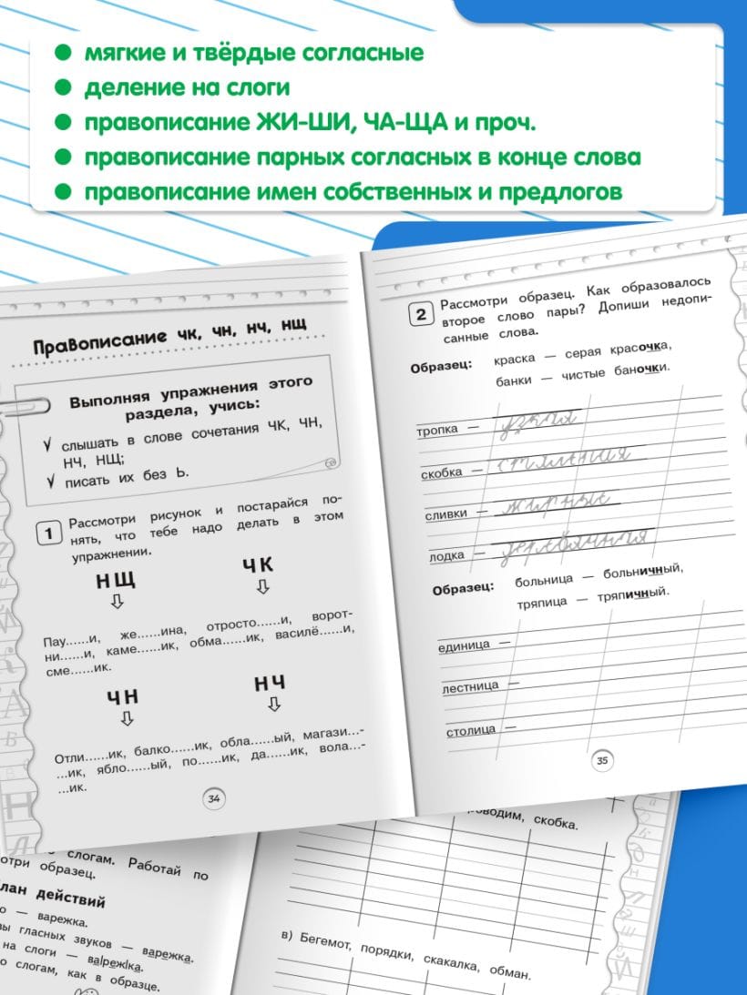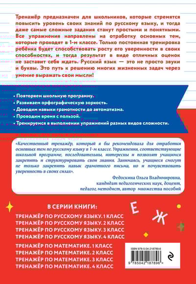 Пособие по русскому языку от издательства «Эксмо» подготовлено в соответствии с требованиями ФГОС для начальной школы и может быть использовано с любым из действующих учебников для 1 класса. Удобный тренажер с интересным современным макетом поможет ребёнку улучшить грамотность, восполнить пробелы, углубить и систематизировать знания. Занимаясь, школьник не только отработает основные темы школьной программы: правописание ЖИ-ШИ, ЧА-ЩА, ЧУ-ЩУ, ЧК, ЧН, НЧ, НЩ, парных согласных в конце слова, имен собственных, предлогов и др., но и научится работать по плану, то есть выполнять определенный алгоритм действий, который поможет ему осознанно применять правила. Когда навык грамотного письма будет доведен до автоматизма, результат в виде твердых знаний и отличных оценок не заставит себя ждать.