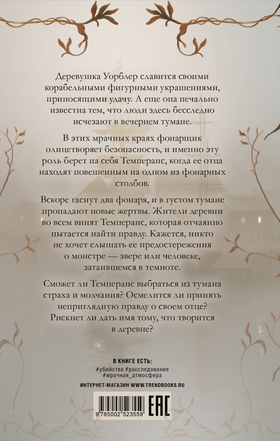 Деревушка Уорблер славится своими корабельными фигурными украшениями, приносящими удачу. А еще она печально известна тем, что люди здесь бесследно исчезают в вечернем тумане. В этих мрачных краях фонарщик олицетворяет безопасность, и именно эту роль берет на себя Темперанс, когда ее отца находят повешенным на одном из фонарных столбов. Вскоре гаснут два фонаря, и в густом тумане пропадают новые жертвы. Жители деревни во всем винят Темперанс, которая отчаянно пытается найти правду. Кажется, никто не хочет слышать ее предостережения о монстре — звере или человеке, затаившемся в темноте.