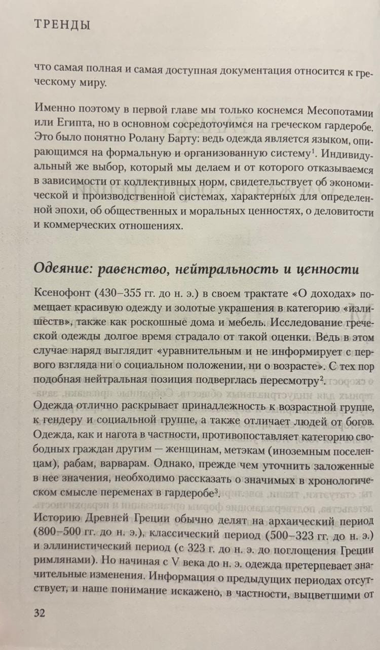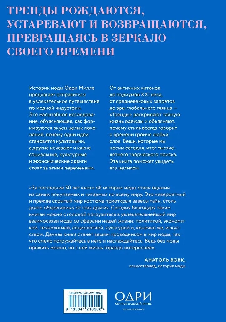 Тренды рождаются, устаревают и возвращаются, превращаясь в зеркало своего времени. Историк моды Одри Милле предлагает отправиться в увлекательное путешествие по истории модной индустрии. Это масштабное исследование, объясняющее, как формируются вкусы целых поколений и почему одни идеи становятся культовыми, а другие исчезают, и какие социальные, культурные и экономические сдвиги стоят за этими переменами. От античных хитонов до подиумов XXI века, от средневековых запретов до эры глобального глянца — «Тренды» раскрывают тайную жизнь одежды и объясняют, почему стиль всегда говорит о времени громче любых слов. Одежда, которую мы носим сегодня, итог тысячелетнего творческого поиска. Эта книга поможет увидеть его целиком.