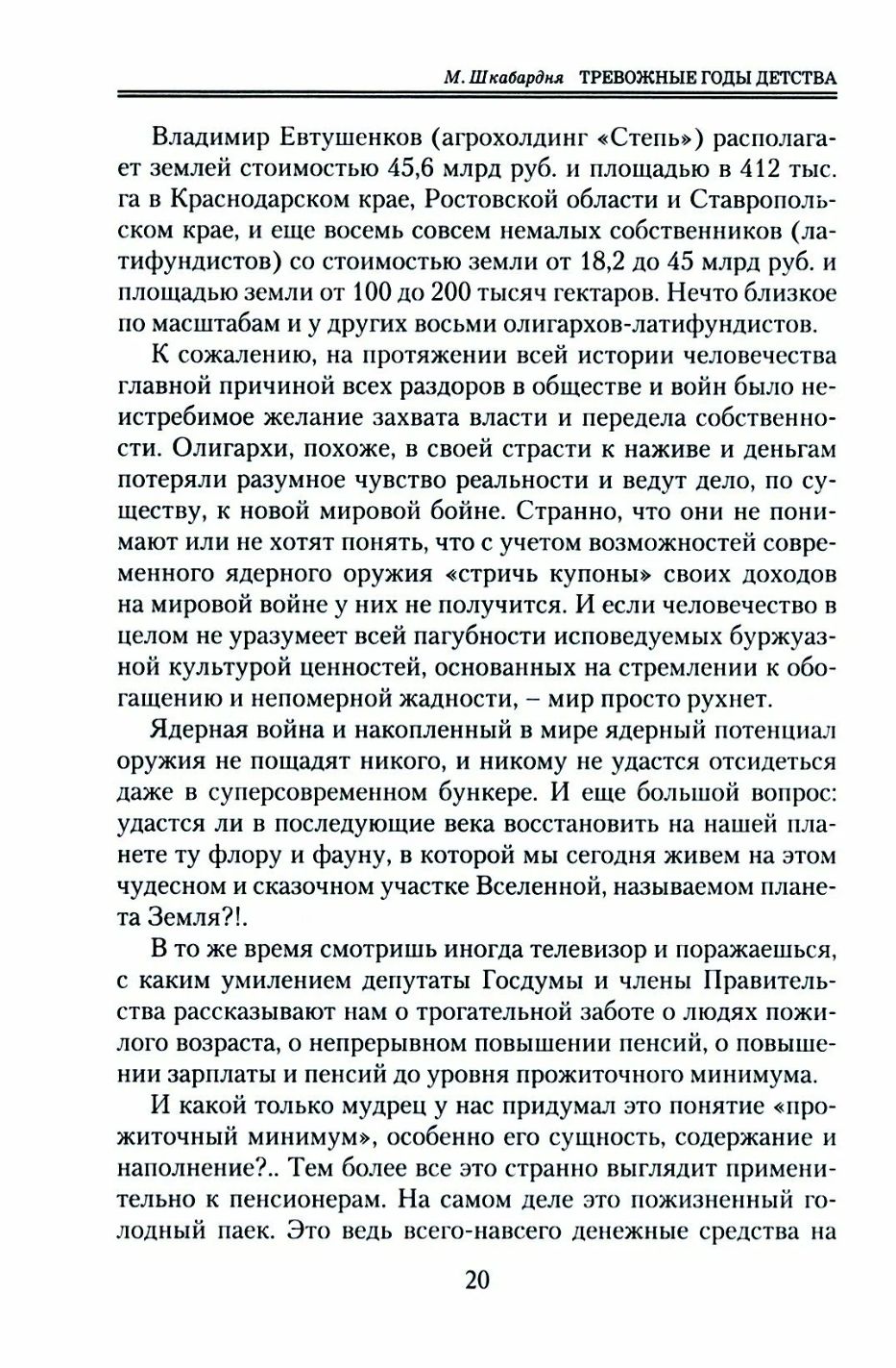 В ваших руках – пронзительное повествование о жизни, написанное Михаилом Сергеевичем Шкабардней – патриархом советской промышленности, Героем Социалистического Труда, лауреатом Государственной премии СССР, доктором технических наук, профессором. Это не только история о кубанском пареньке из бедной казацкой семьи, который, несмотря на испытания 1930-х годов, военного и послевоенного времени, благодаря стремлению к знаниям, честному труду, способностям был выдвинут к вершинам исполнительной власти в стране – стал Министром приборостроения, средств автоматизации и систем управления СССР, а потом и Управляющим делами Совета министров СССР, членом Президиума Советского Правительства, но это еще и рассказ о горячо любимой малой родине автора книги – о родной станице Тбилисской, о Краснодарском крае. Это размышления о судьбе «большой родины» – Советском Союзе, России, широкие философские обобщения на материале последних десятилетий. Некоторые из рассказов были опубликованы в ранее изданных его книгах.