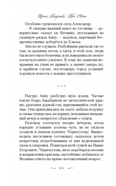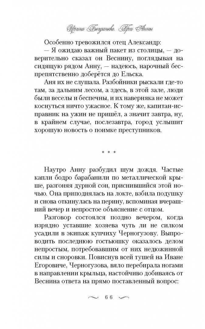 Удивительный, захватывающий сюжет нового романа Ирины Богдановой «Три Анны», – словно непрерывный бег по спирали времени. Он проводит читателя от начала XX века до наших дней через целую череду образов, поражающих воображение своей многозначительностью. Действие романа разворачивается, когда юная Анна Веснина возвращается к отцу из закрытого пансиона. Она сразу сталкивается с тайной, полностью меняющей её жизнь и затрагивающей судьбы двух других Анн, которым только суждено родиться. На протяжении века три Анны из трёх разных эпох слышат отзвуки давних событий, встречая на своём пути верность и предательство, сломленных жизнью людей и благородных друзей. Трём Аннам предстоит постигнуть глубины человеческих чувств и выбрать единственно правильную дорогу к любви и миру.