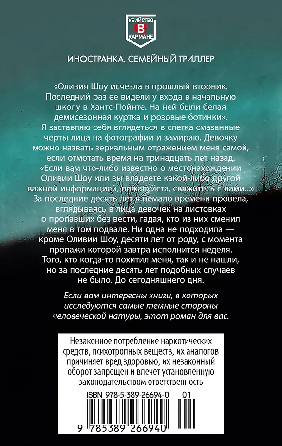 Но вот однажды с листовки о пропавших детях на Лэйн смотрит удивительно знакомое лицо: десятилетняя Оливия, совсем такая, как она сама в детстве. Дело поручено детективу Шону Ортису, именно он нашел Лэйн на обочине дороги десять лет назад и был добр к ней. Только достаточно ли это веская причина, чтобы она стала сотрудничать со следствием?..