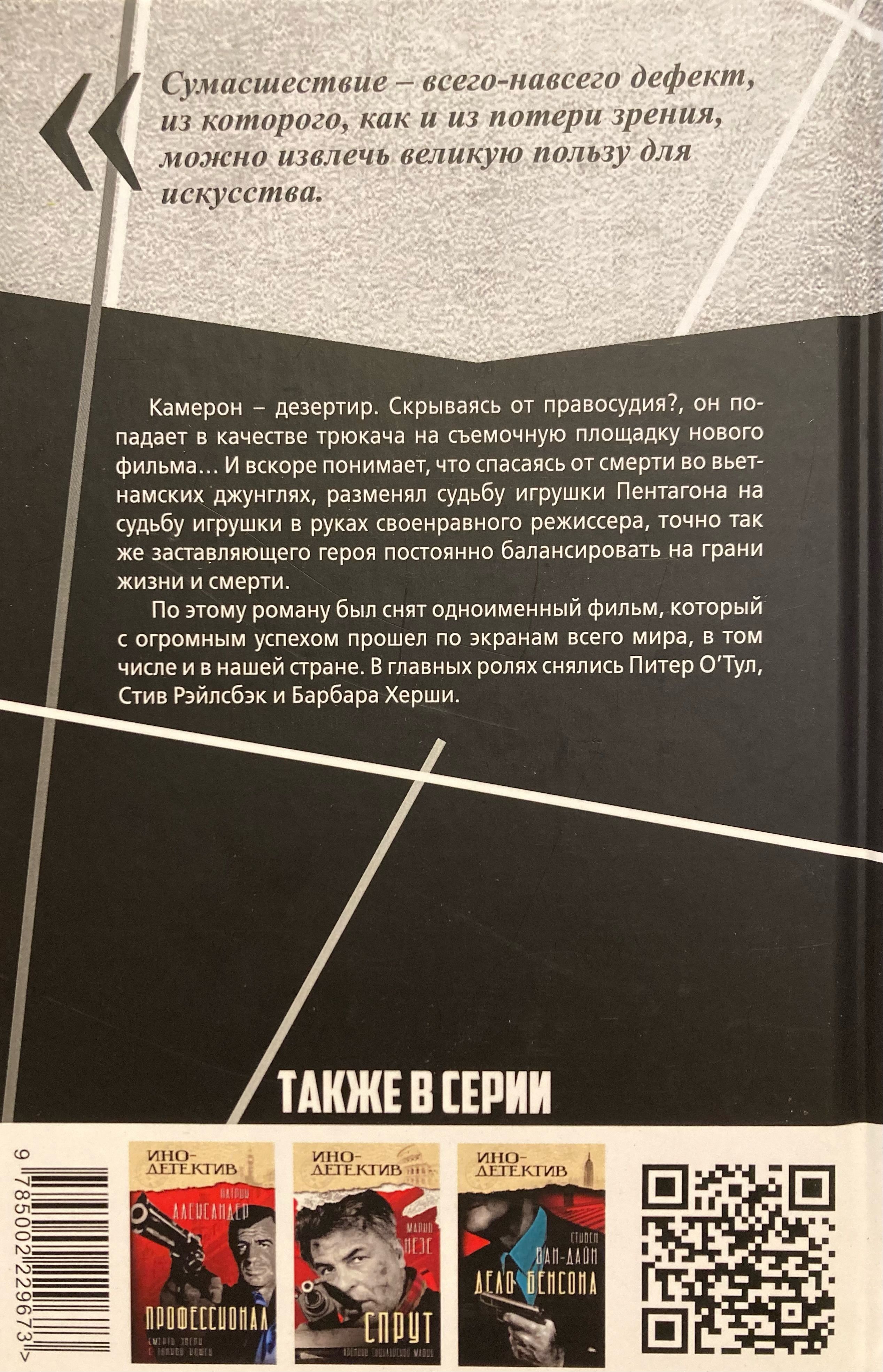 Камерон – дезертир. Скрываясь от правосудия, он попадает в качестве трюкача на съемочную площадку нового фильма… И вскоре понимает, что спасаясь от смерти во вьетнамских джунглях, разменял судьбу игрушки Пентагона на судьбу игрушки в руках своенравного режиссера, точно так же заставляющего героя постоянно балансировать на грани жизни и смерти. По этому роману был снят одноименный фильм, который с огромным успехом прошел по экранам всего мира. В главных ролях снялись Питер О’Тул, Стив Рэйлсбэк и Барбара Херши.