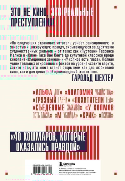 Фраза «Основано на реальных событиях» в начале фильма моментально делает любой сюжет стократ интереснее. Ведь жизнь — лучший сценарист. То, что порой происходит в реальности, куда более шокирующее и невероятное, чем способен придумать даже самый искусный драматург. И эта книга как раз о тех фильмах, создатели которых вдохновлялись реальными преступлениями. Громкие убийства, невообразимая жестокость, извращенные пытки, дерзкие ограбления, кошки-мышки с детективами и леденящий душу страх — излюбленный набор любого поклонника тру-крайма.