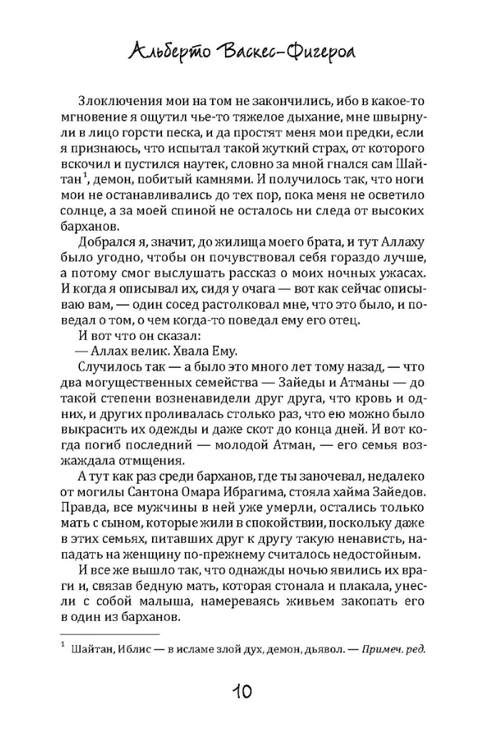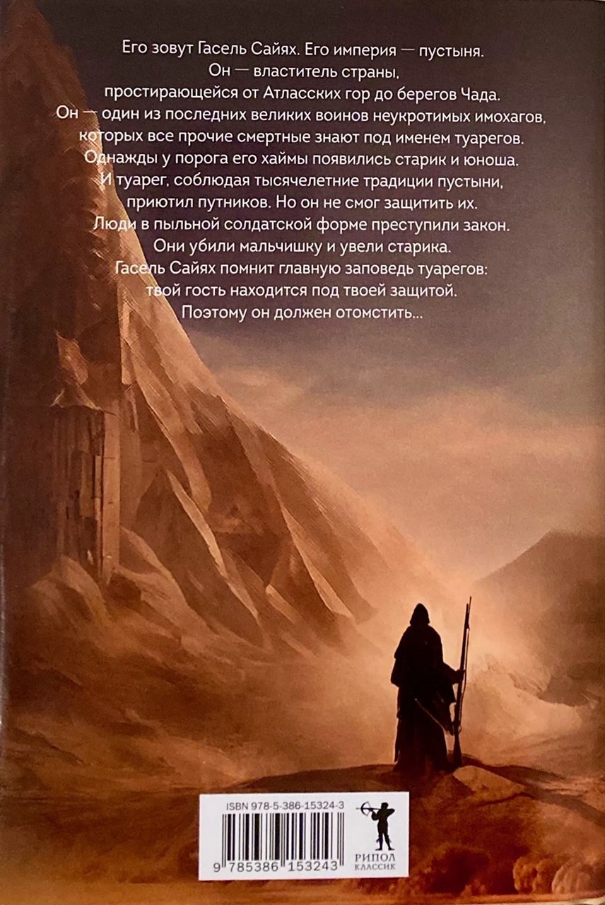 Его зовут Гасель Сайях. Его империя — пустыня. Он — властитель страны, простирающейся от Атласских гор до берегов Чада. Он — один из последних великих воинов неукротимых имохагов, которых все прочие смертные знают под именем туарегов. Однажды у порога его хаймы появились старик и юноша. И туарег, соблюдая тысячелетние традиции пустыни, приютил путников.Но он не смог защитить их. Люди в пыльной солдатской форме преступили закон. Они убили мальчишку и увели старика. Гасель Сайях помнит главную заповедь туарегов: твой гость находится под твоей защитой. Поэтому он должен отомстить... Перед вами самый известный, самый издаваемый во всем мире роман самого читаемого испаноязычного автора современности Альберто Васкеса-Фигероа.