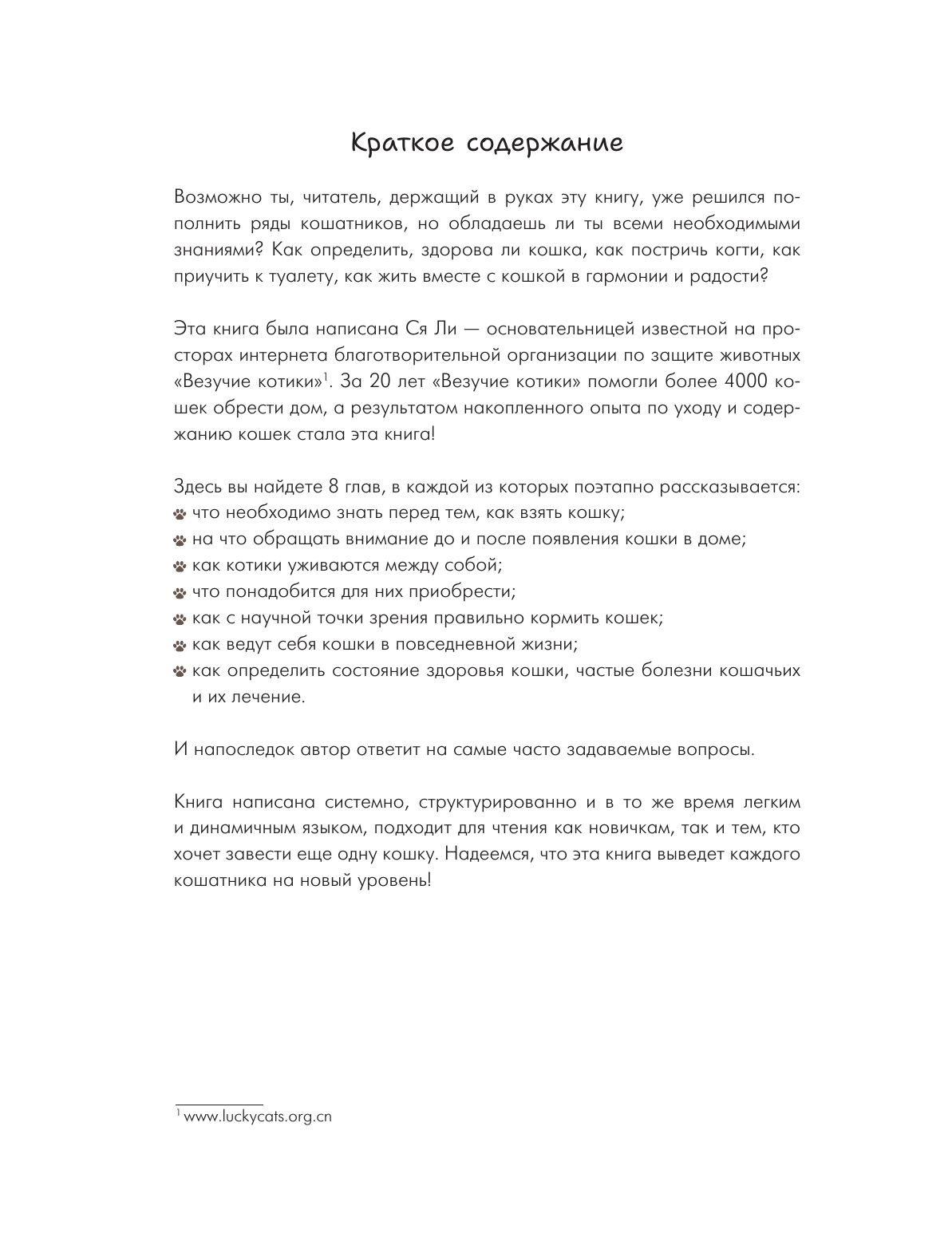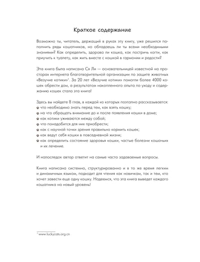 Эта книга создана Цзэн Ли, основательницей организации «Везучие котики», которая занимается защитой животных. В ней собраны знания и опыт по уходу за кошками, накопленные за 20 лет работы организации.