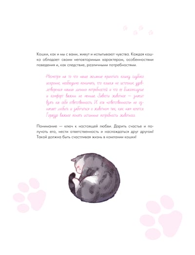 Изначально материал книги возник из памяток, которые волонтеры отдавали новоиспеченным владельцам кошек, и теперь представляет собой тщательно оформленный и структурированный гид по заботе о ваших пушистых друзьях.