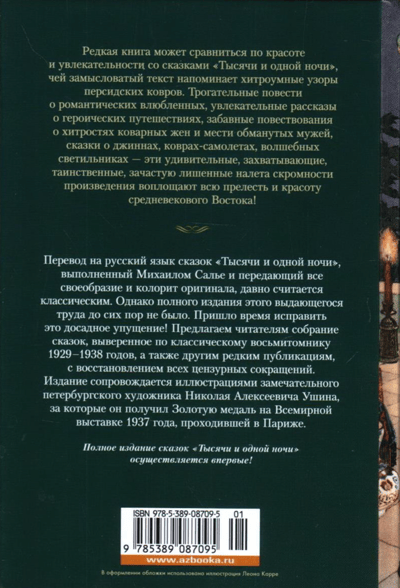 Редкая книга может сравниться по красоте и увлекательности со сказками «Тысячи и одной ночи», чей замысловатый текст напоминает хитроумные узоры персидских ковров. Трогательные повести о романтических влюбленных, увлекательные рассказы о героических путешествиях, забавные повествования о хитростях коварных жен и мести обманутых мужей, сказки о джиннах, коврах-самолетах, волшебных светильниках — эти удивительные, захватывающие, таинственные зачастую лишенные налета скромности произведения воплощают всю прелесть и красоту средневекового Востока! Перевод на русский язык сказок «Тысячи и одной ночи», выполненный Михаилом Салье и передающий всё своеобразие и колорит оригинала, давно считается классическим. Однако полного издания этого выдающегося труда до сих пор не было. Пришло время исправить это досадное упущение! Предлагаем читателям собрание сказок, выверенное по классическому восьмитомнику 1929–1939 годов, а также другим редким публикациям, с восстановлением всех цензурных сокращений. Издание сопровождается иллюстрациями замечательного петербургского художника Николая Алексеевича Ушина, за которые он получил Золотую медаль на Всемирной выставке 1937 года, проходившей в Париже. В третью книгу вошли сказки, рассказанные Шахразадой в 719-1001 ночи. Также в том включены сказки, не вошедшие классическое восьмитомное собрание. Среди них такие известные сюжеты, как «Халиф на час», «Рассказ про Ала-ад-дина и заколдованный светильник», «Рассказ про Али-Бабу и сорок воров» и другие.